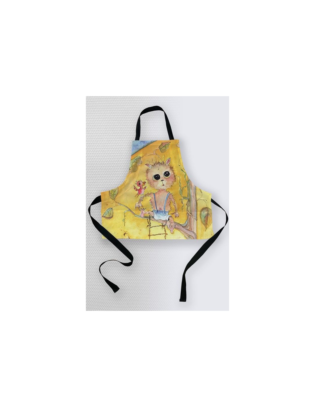 "Camaraderie" by artist Christiane Lapointe. Child apron measuring 17" x 18" made of textured canvas fabric (100% polyester) with adjustable 100% black cotton strap and three pockets. Machine washable in cold water on delicate cycle.