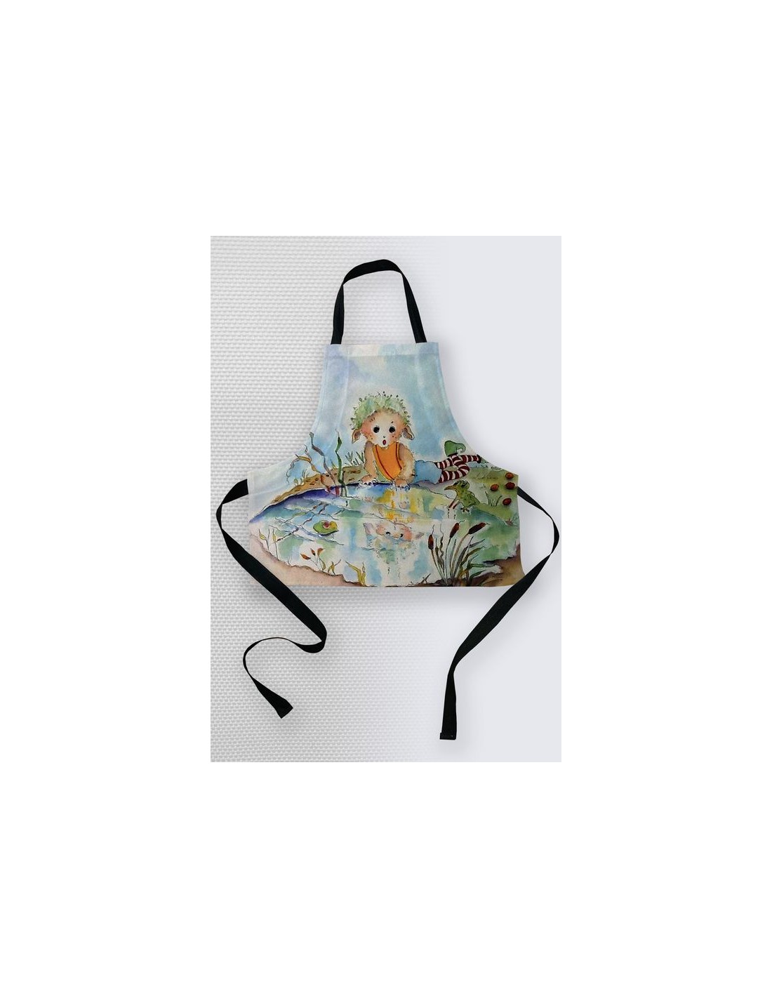 "Reflection" by artist Christiane Lapointe. Child apron measuring 17" x 18" made of textured canvas fabric (100% polyester) with adjustable 100% black cotton strap and three pockets. Machine washable in cold water on delicate cycle.