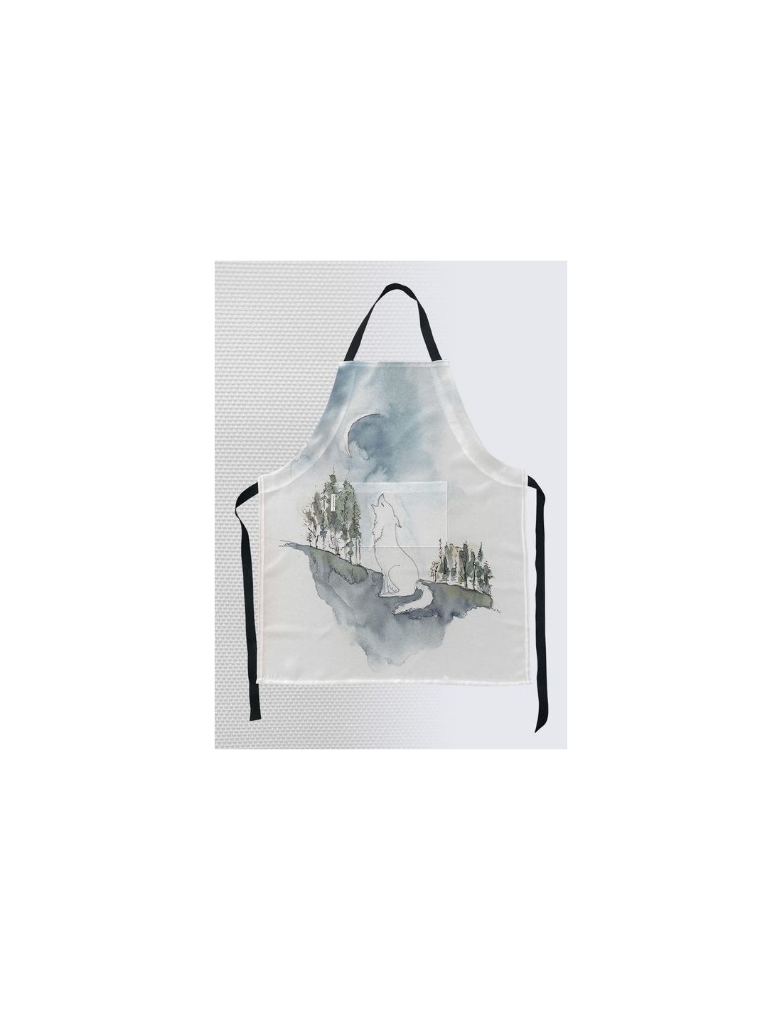 "Moonshadow" by artist Christiane Lapointe. Adult size apron measuring 21" x 36" made of textured canvas fabric (100% polyester) with adjustable 100% black cotton strap and a front pocket. Machine washable in cold water on delicate cycle.