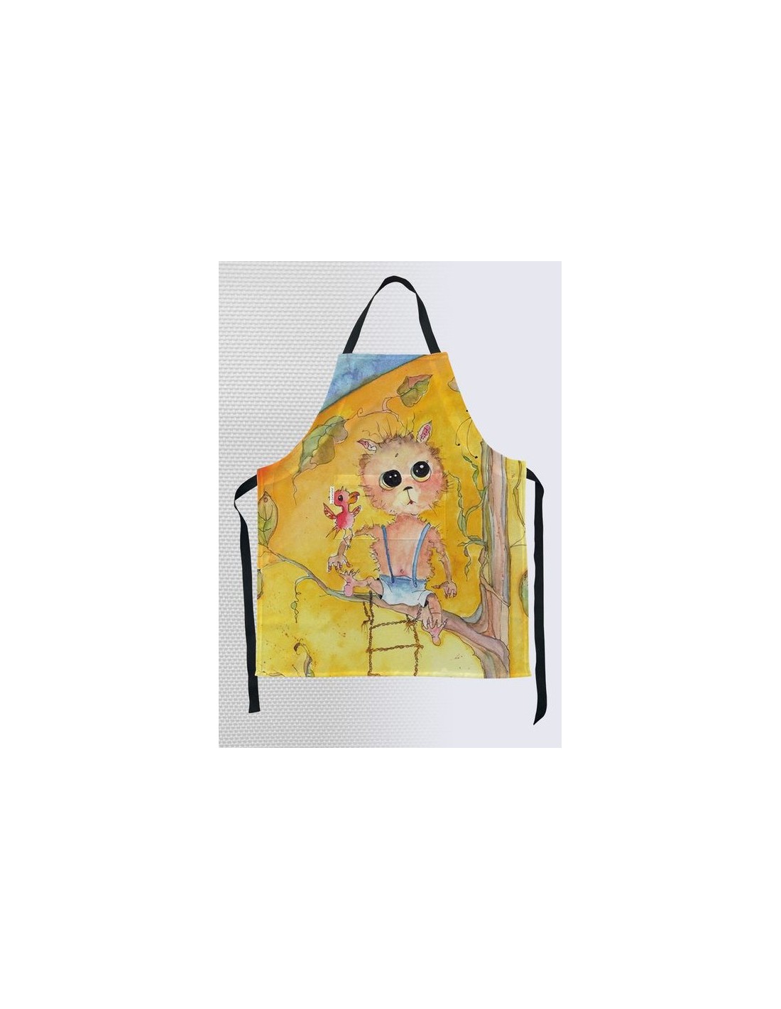 "Camaderie" by artist Christiane Lapointe. Adult size apron measuring 21" x 36" made of textured canvas fabric (100% polyester) with adjustable 100% black cotton strap and a front pocket. Machine washable in cold water on delicate cycle.
