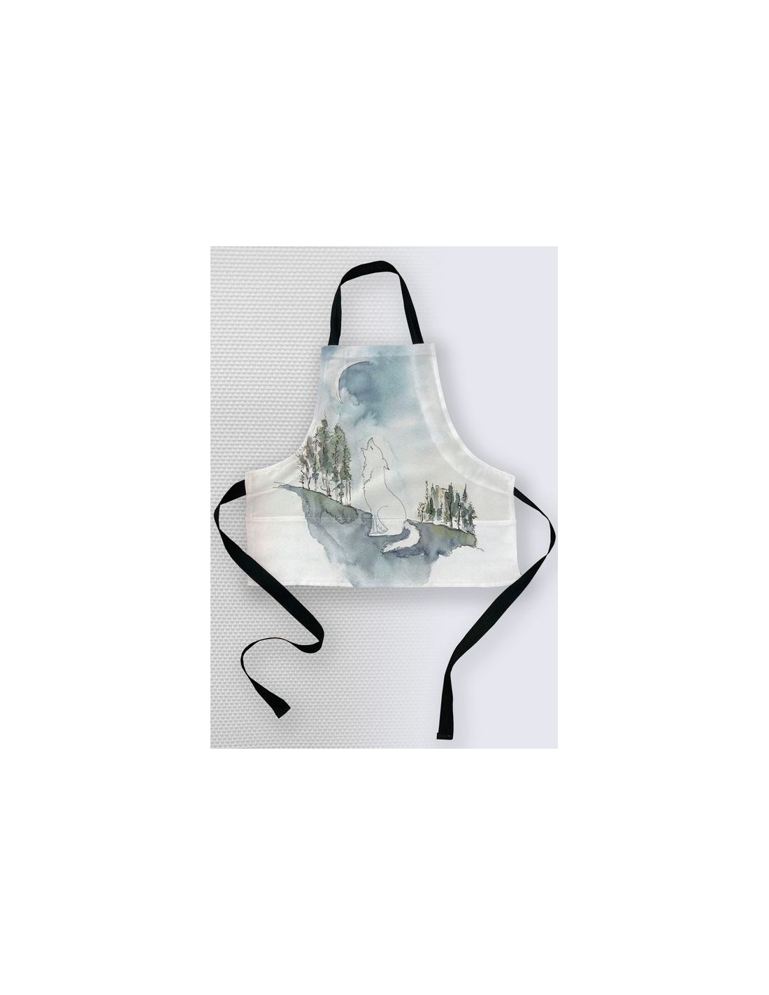 "Moonshadow" by artist Christiane Lapointe. Child apron measuring 17" x 18" made of textured canvas fabric (100% polyester) with adjustable 100% black cotton strap and three pockets. Machine washable in cold water on delicate cycle.