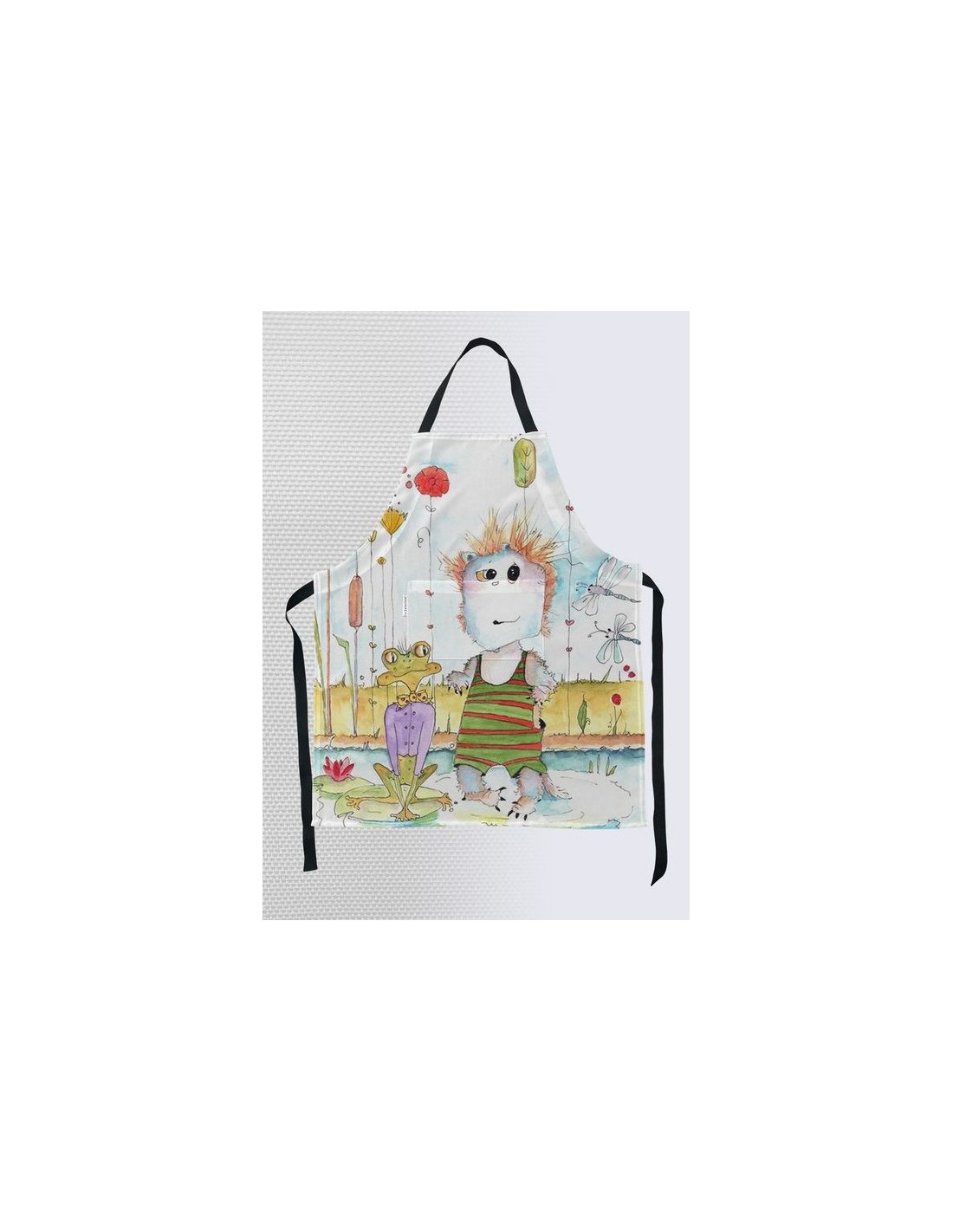 "Marigot" by artist Christiane Lapointe. Adult size apron measuring 21" x 36" made of textured canvas fabric (100% polyester) with adjustable 100% black cotton strap and a front pocket. Machine washable in cold water on delicate cycle.