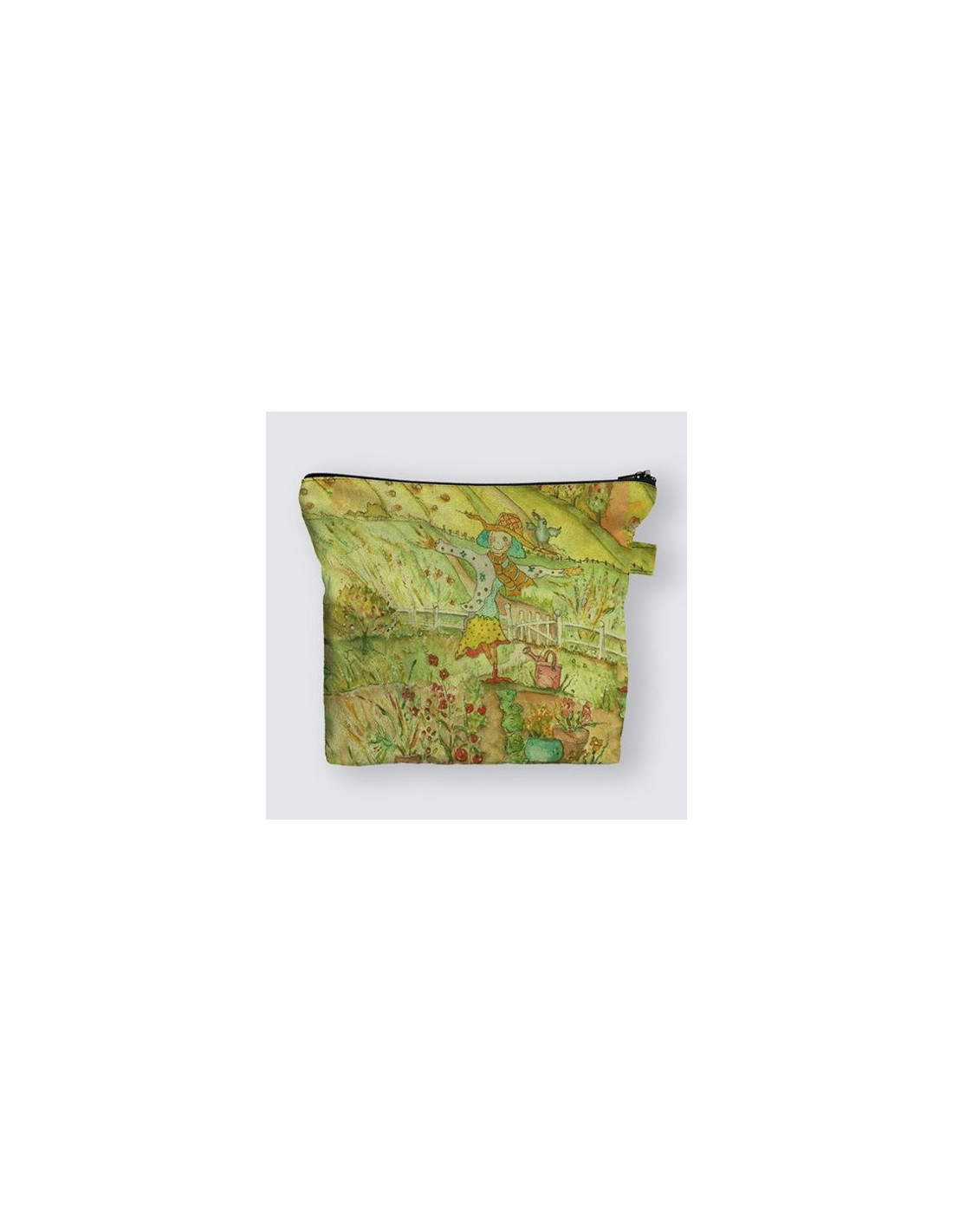 "Radiance" by artist Christiane Lapointe. Stylish and compact, this pouch is perfect for travel essentials. Woven suede pouch measuring 7.5" x 9.5" with a base of 6.7" and a depth of 2". It has small front pockets with a height of 3.5", a black zipper opening. Machine washable.