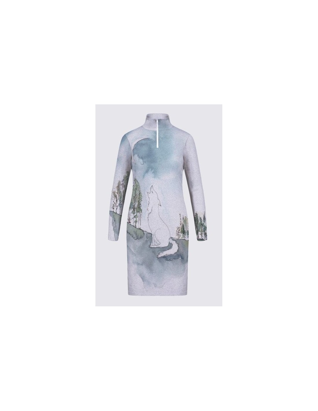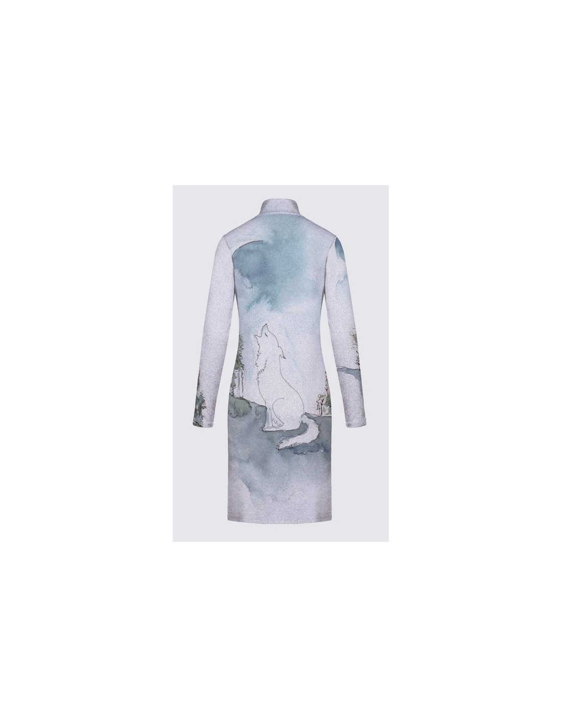 "Moonshadow" by artist Christiane Lapointe. Made of soft and cozy sweater knit fabric in heather grey with a high funnel collar with zip opening. The dress is a knee length semi-fitted dress with long sleeves and a flattering slit detail at the hem.