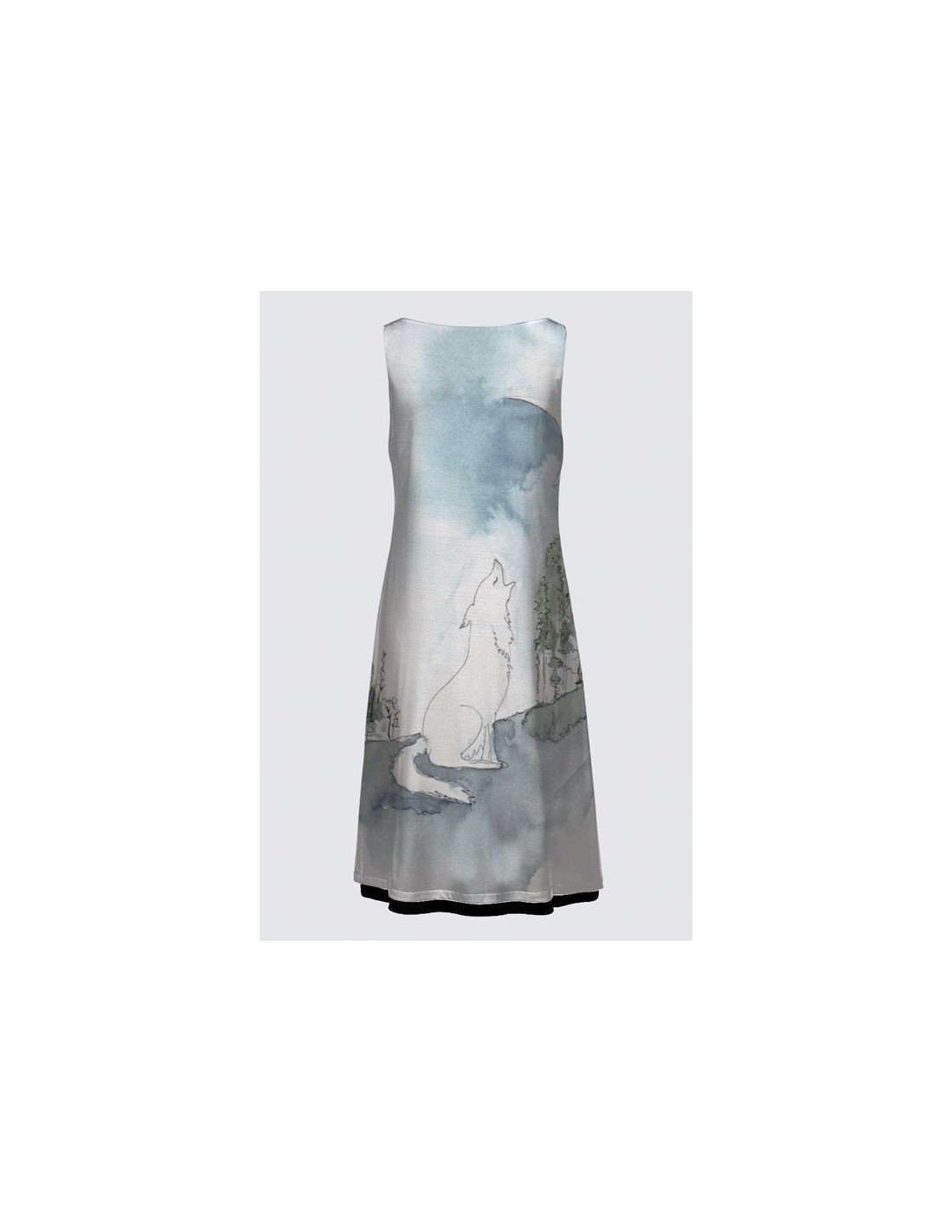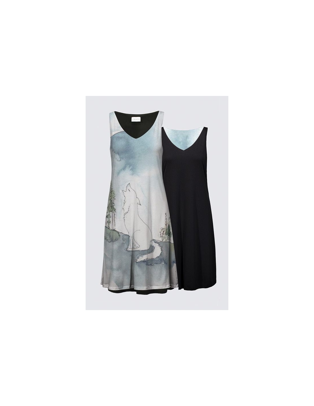 "Moonshadow" by artist Christiane Lapointe. This dress is reversible (original art print on one side and full black on the other side) with a neck drop of 7.5" which can also be worn on the back. Made of premium ITY Knit for self and lining (95% Polyester, 5% Spandex). The length is 38".