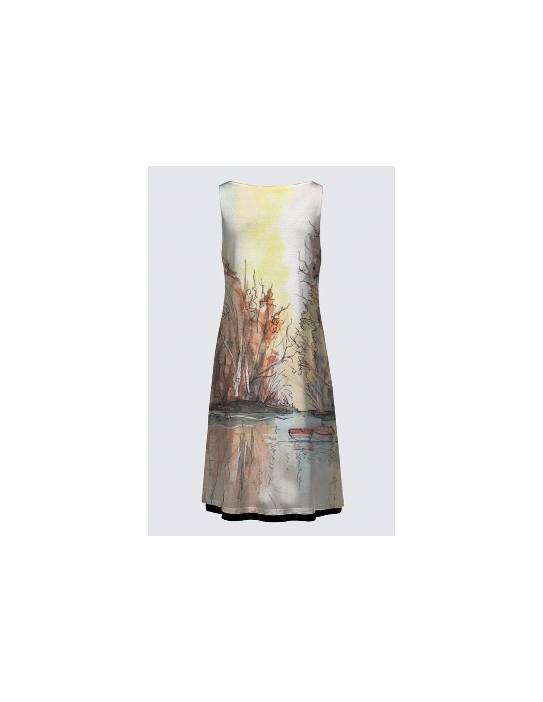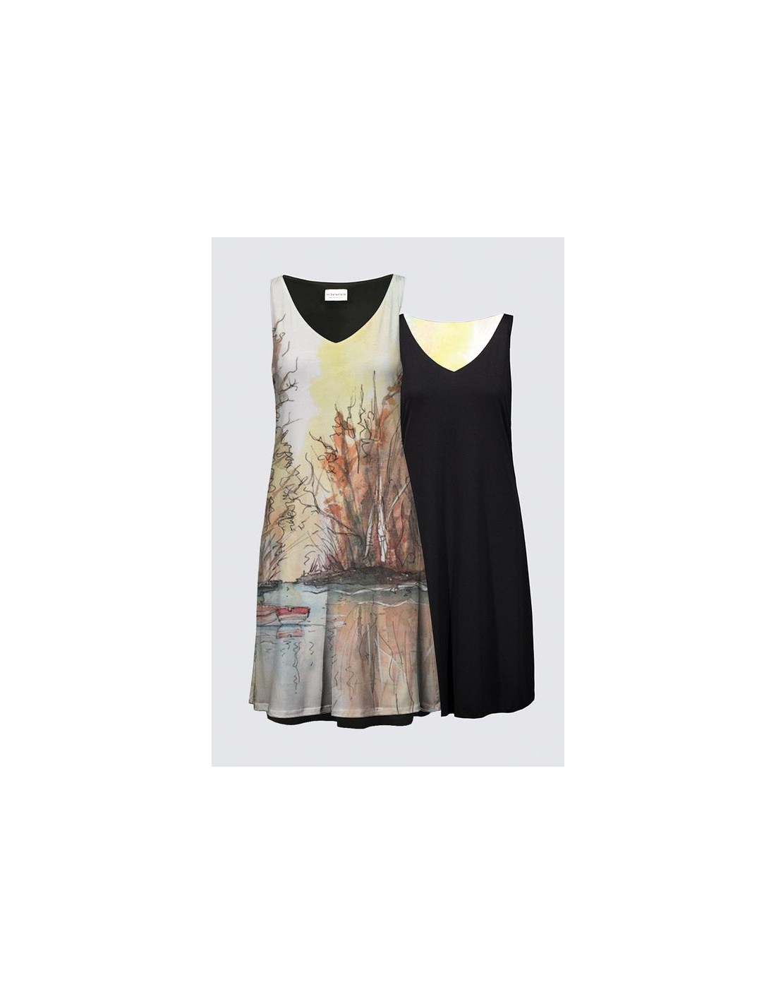 "Tranquility" by artist Christiane Lapointe. This dress is reversible (original art print on one side and full black on the other side) with a neck drop of 7.5" which can also be worn on the back. Made of premium ITY Knit for self and lining (95% Polyester, 5% Spandex). The length is 38".