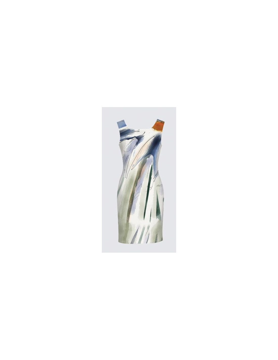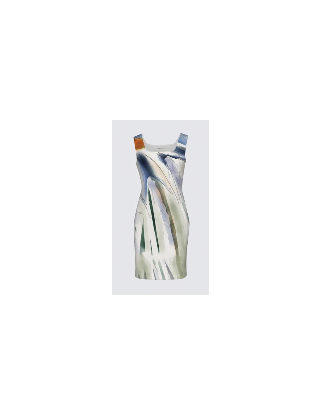 "Perlouse" by artist Christiane Lapointe. Square neckline made of stretch knitted scuba fabric (95% polyester, 5% spandex) with darts at chest and at back for optimal close-to-body fit, has a smooth silky-feel finish and a length of 38.5".