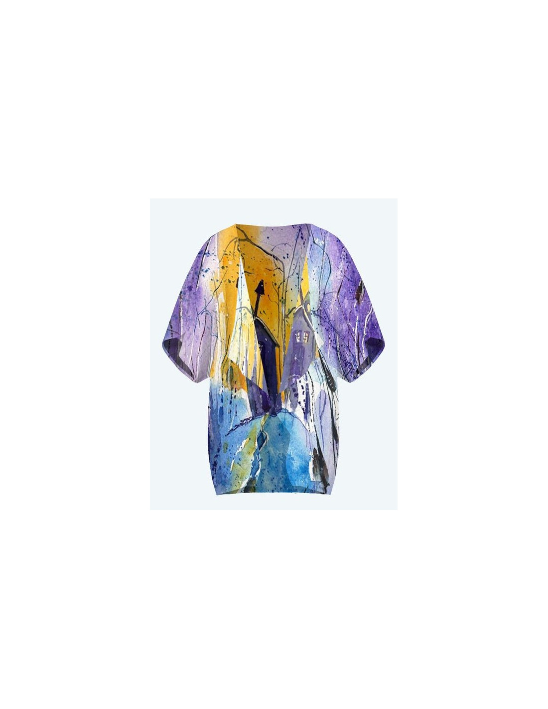 "Illusion" by artist Christiane Lapointe. One size short kimono, 29" in length and 24" width with a loose fit. The front arrives mid-thigh and the sleeves at the elbows.