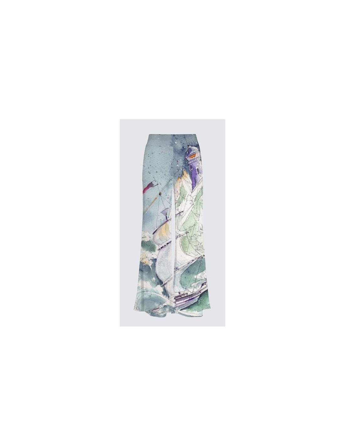 "Centrifuge" by artist Christiane Lapointe. Comfortable palazzo pant that falls loosely over the body, made of premium ITY knit (95% polyester, 5% elastane). The inseam is 30" long with a high rise waist and wide cut leg. Machine wash in cold water on delicate cycle, hang dry.
