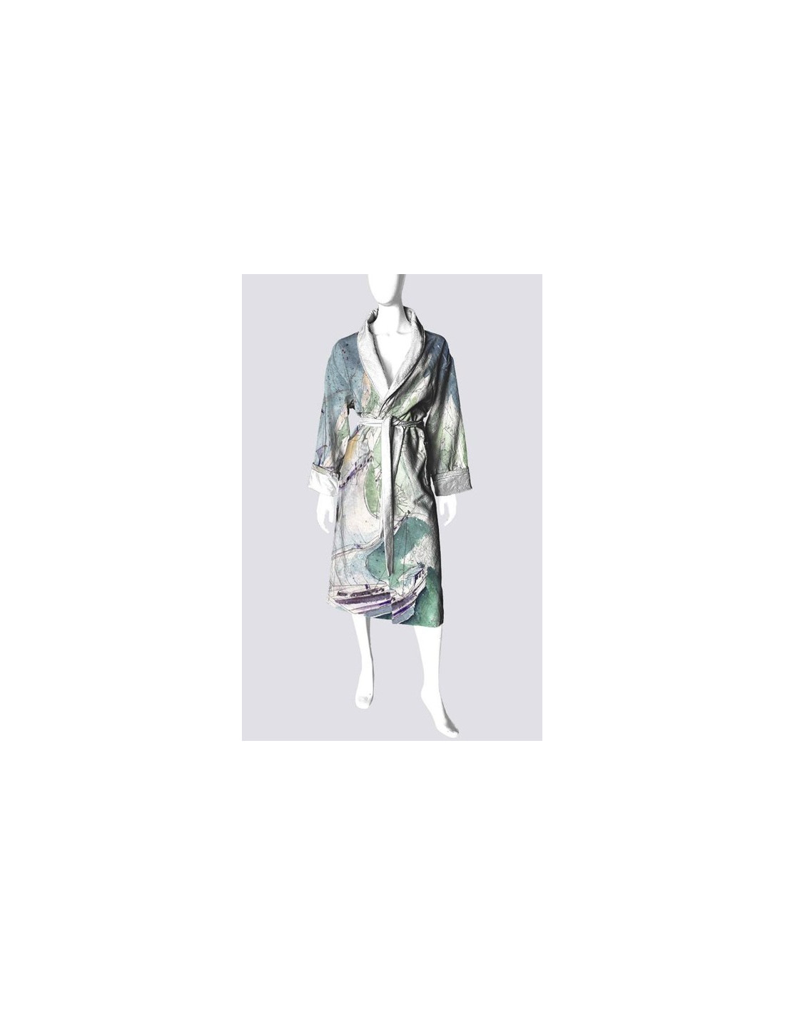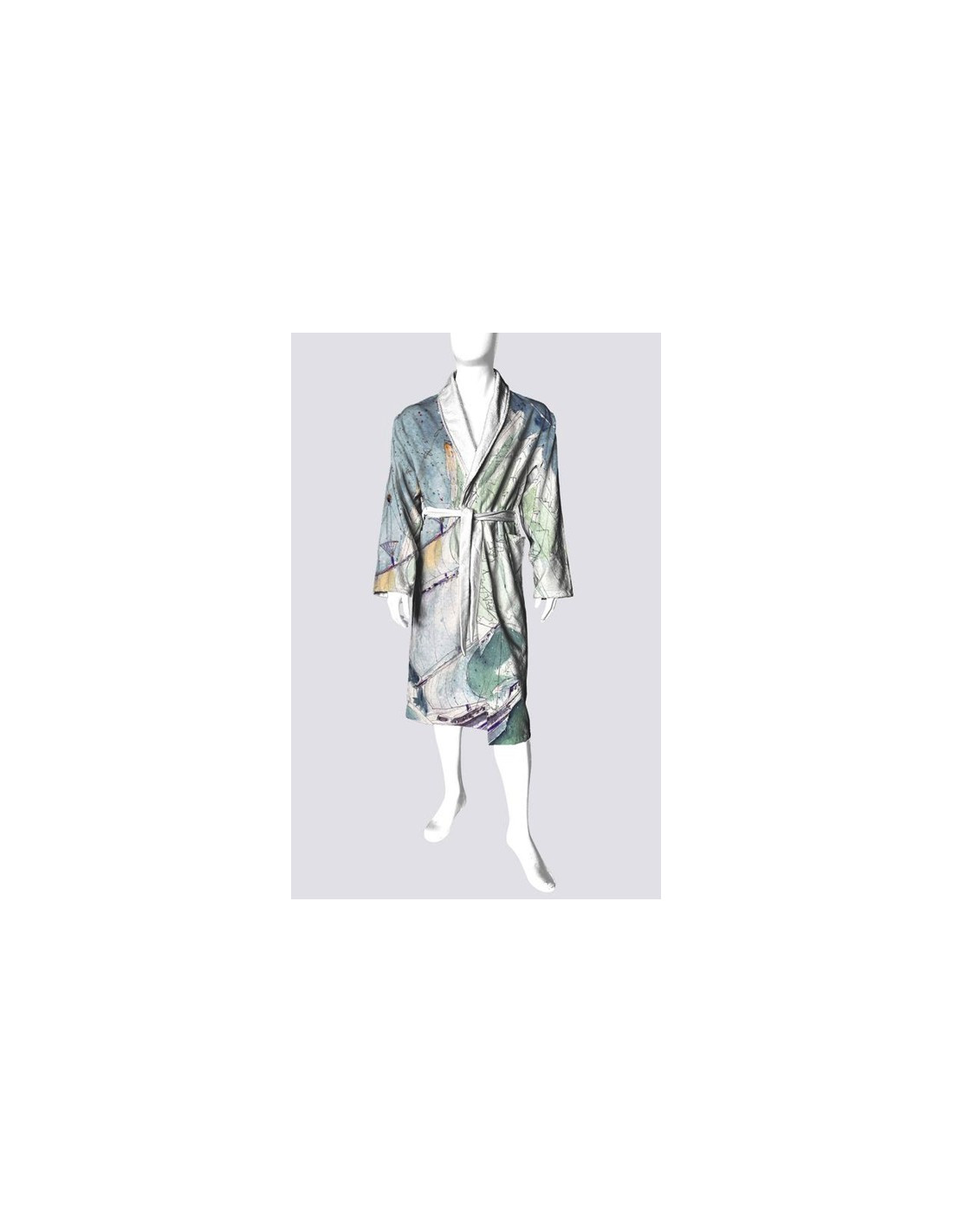 This robe is a must-have for those who appreciate quality and artistry. It is made of a microfiber fabric (95% polyester, 5% spandex) featuring a crisp white collar and interior with a length of 48" and sleeves measuring 31" or 25" when turned up. It has two spacious pockets (6" x 6") and an open front with a secure belt (70".) The back width is 24.5". A one size that will fit a woman up to size extra-large and a man up to size large. Machine washable on delicate cycle in cold water, hang dry.