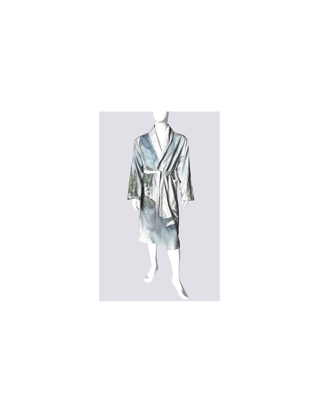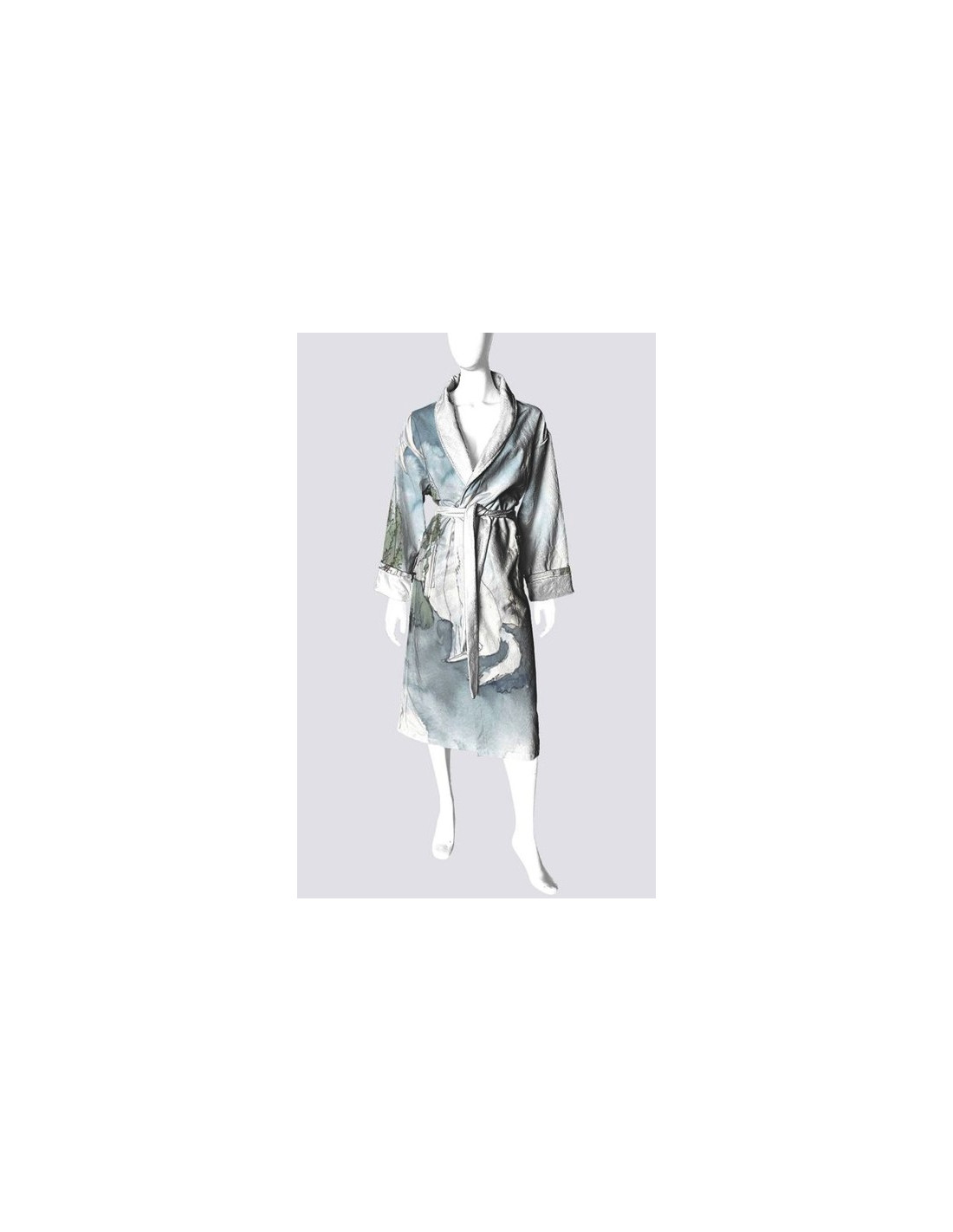 This robe is a must-have for those who appreciate quality and artistry. It is made of a microfiber fabric (95% polyester, 5% spandex) featuring a crisp white collar and interior with a length of 48" and sleeves measuring 31" or 25" when turned up. It has two spacious pockets (6" x 6") and an open front with a secure belt (70".) The back width is 24.5". A one size that will fit a woman up to size extra-large and a man up to size large. Machine washable on delicate cycle in cold water, hang dry.