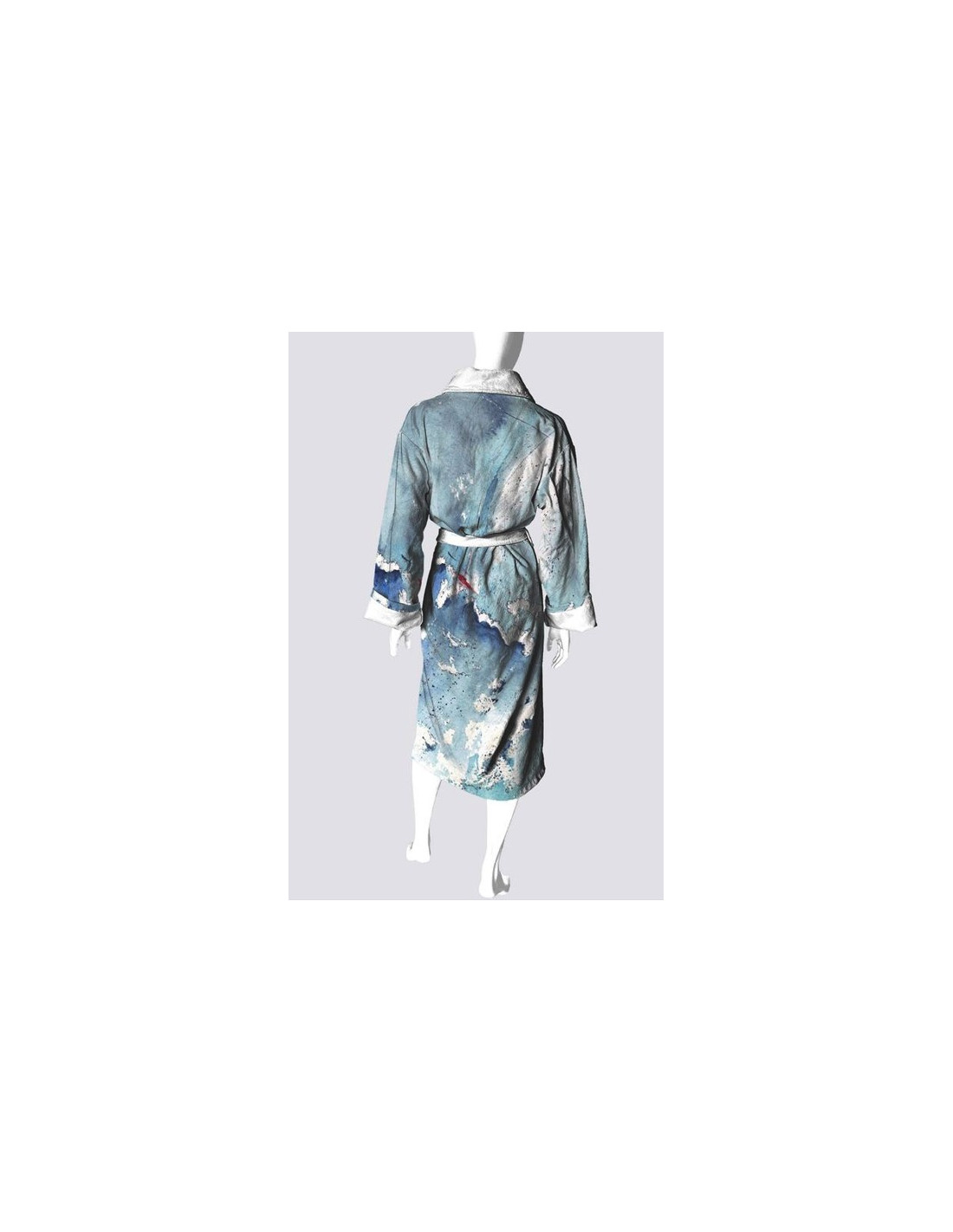 This robe is a must-have for those who appreciate quality and artistry. It is made of a microfiber fabric (95% polyester, 5% spandex) featuring a crisp white collar and interior with a length of 48" and sleeves measuring 31" or 25" when turned up. It has two spacious pockets (6" x 6") and an open front with a secure belt (70".) The back width is 24.5". A one size that will fit a woman up to size extra-large and a man up to size large. Machine washable on delicate cycle in cold water, hang dry.