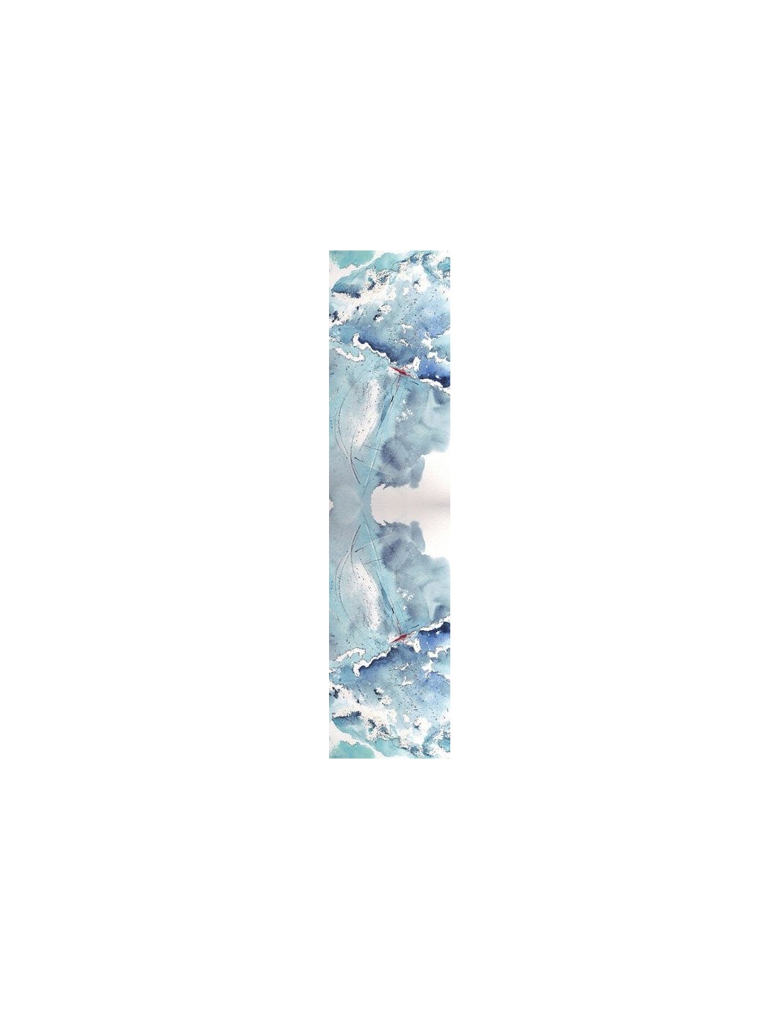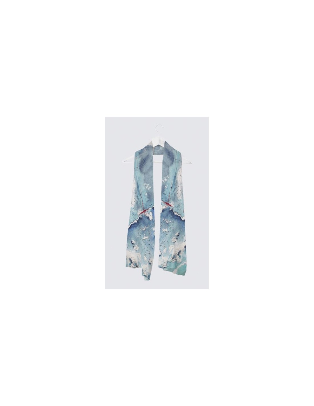 "Turbulence" by artist Christiane Lapointe. Soft chiffon fabric scarf (100% polyester) with plain finish. Colors and tones are made to complement the dresses and tops made with the same original art print. Dimensions are 16" x 65". Machine washable in cold water on delicate cycle, hang dry.