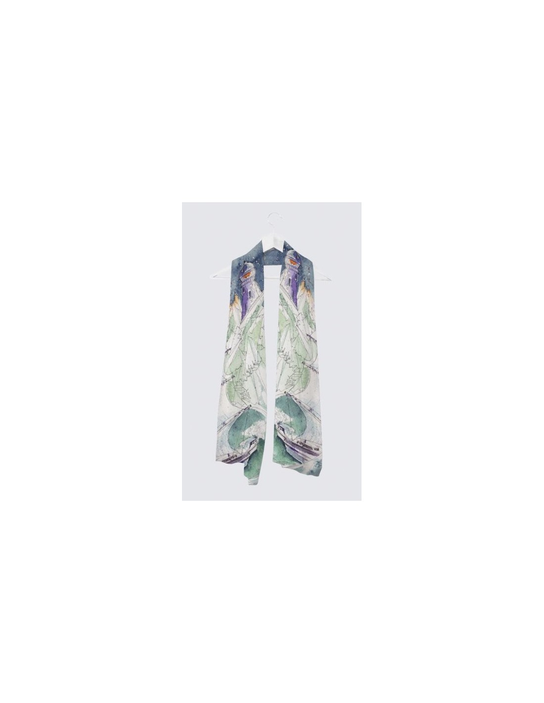 "Centrifuge" by artist Christiane Lapointe. Soft knit chiffon fabric scarf (100% polyester) with merrow edge finish. Colors and tones are made to complement the dresses and tops made with the same original art print. Dimensions are 16” x 71”. Machine washable in cold water on delicate cycle, hang dry.