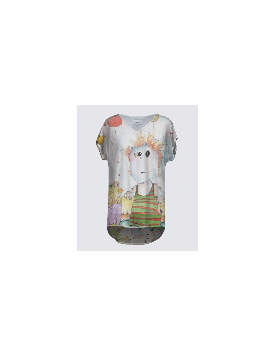 "Marigot" by artist Christiane Lapointe. ITY white tank with Premium ITY Knit (95% Polyester, 5% Spandex). High-low chiffon over layer (100% Polyester) with Dolman sleeves. Length: 31.5”. Made oversized (consider buying a size smaller than you normally would).