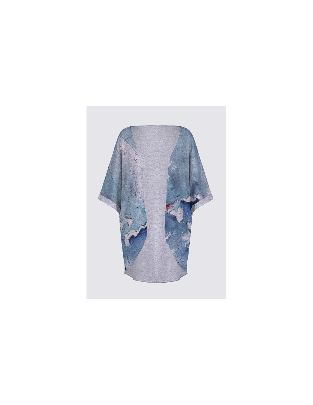 "Turbulence" par l'artiste Christiane Lapointe. Cardigan ayant un devant arrondi avec manches courtes au-dessus des coudes, fabriqué d'un tissu tricot super doux avec base gris chiné (95% Polyester, 5% Élasthanne). Longueur du dos 33".