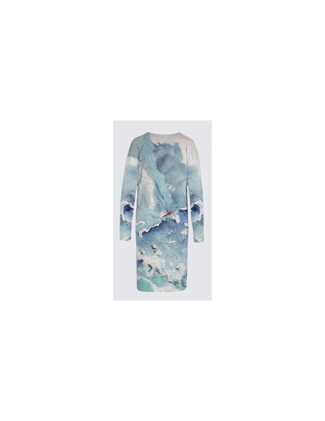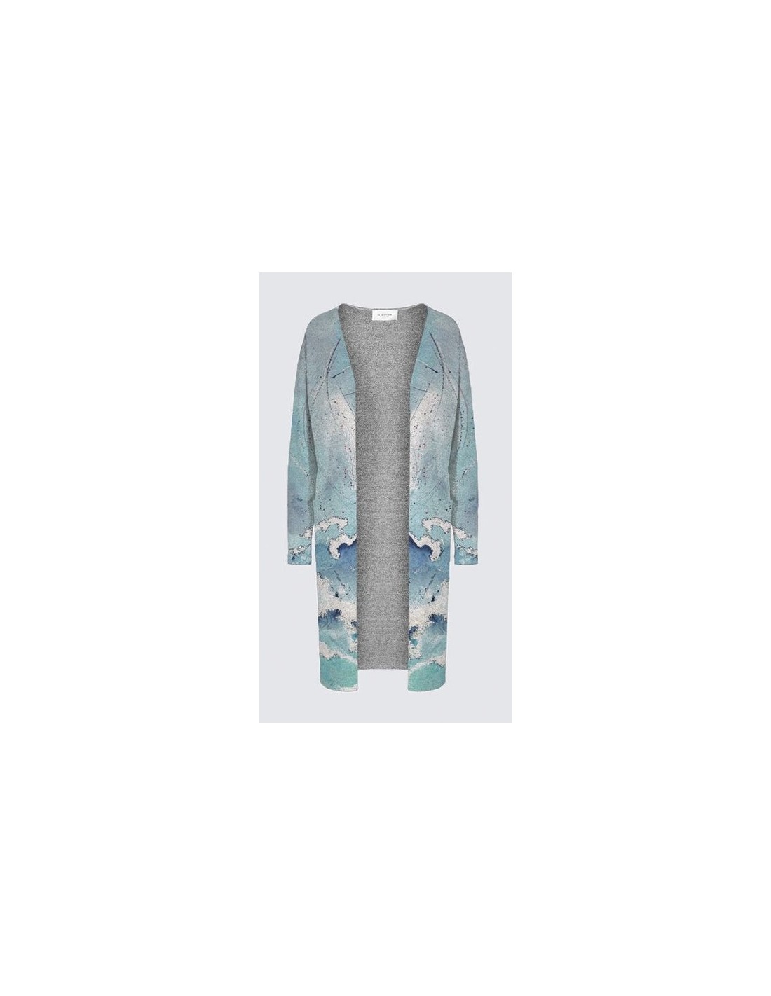 "Turbulence" par l'artiste Christiane Lapointe. Cardigan avec devant ouvert et poches appliquées au devant. Longueur: 40". Tissu tricot super doux avec base gris chiné (95% Polyester, 5% Élasthanne).
