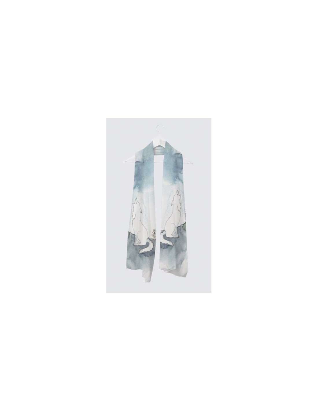 "Ombre de Lune" par l'artiste Christiane Lapointe. Foulard fait d'un tissu en chiffon doux et léger (100% polyester) d'une grandeur de 16" x 65". Les couleurs et tons sont faits pour complémenter les robes et les hauts ayant le même imprimé d'oeuvre d'art originale. Lavable à la machine au cycle délicat, séchez à plat.