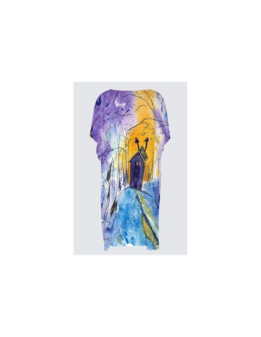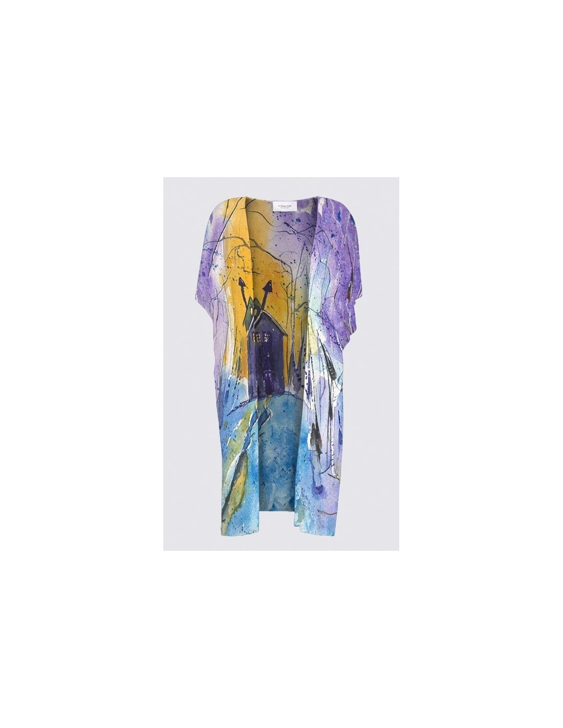 "Illusion" par l'artiste Christiane Lapointe. Kimono, devant et dos en tricot de chiffon (100% polyester) avec fentes sur les côtés et coutures extérieures exposées. Finition au point merrow. Taille unique. Longueur 40". Lavable à la machine au cycle délicat à l'eau froide, séchez à plat.