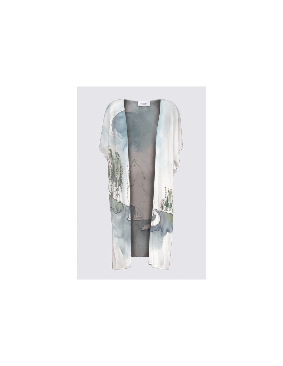 "Ombre de Lune" par l'artiste Christiane Lapointe. Kimono, devant et dos en tricot de chiffon (100% polyester) avec fentes sur les côtés et coutures extérieures exposées. Finition au point merrow. Taille unique. Longueur 40". Lavable à la machine au cycle délicat à l'eau froide, séchez à plat.