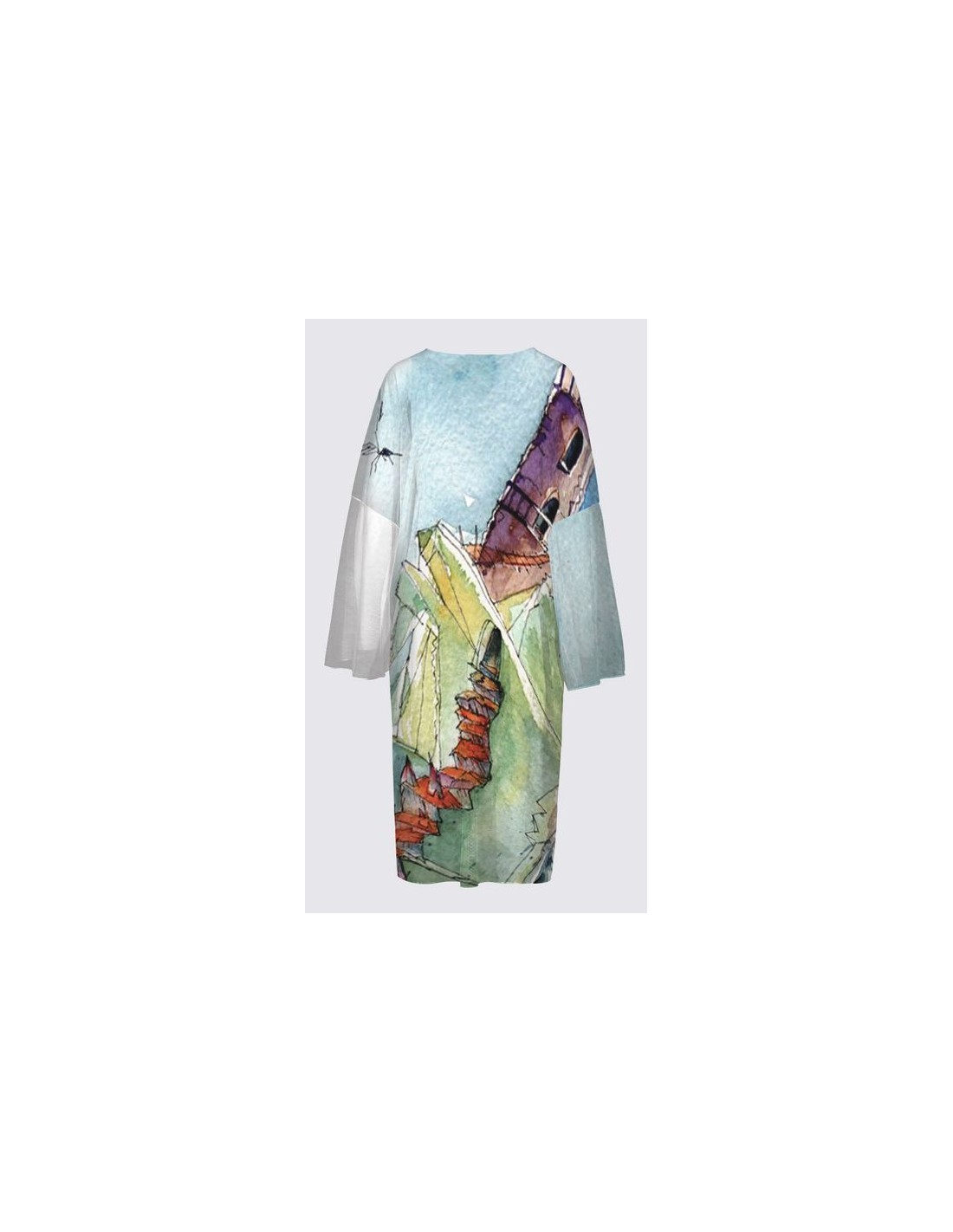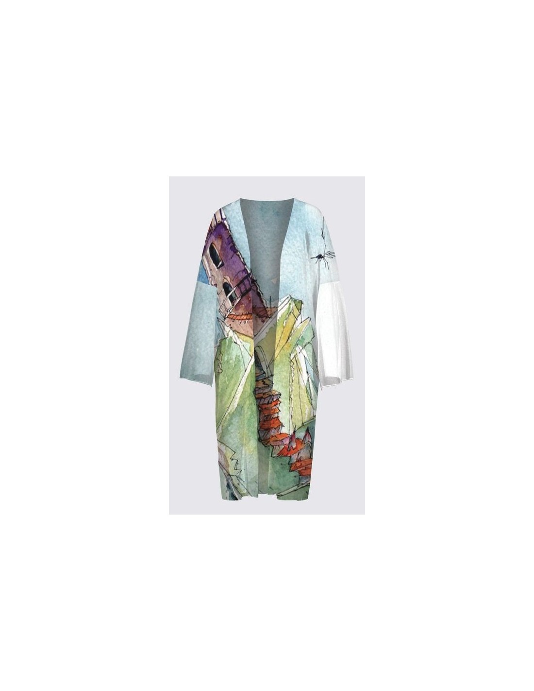 "Oasis" par l'artiste Christiane Lapointe. Kimono avec une coupe ample de taille unique d'une longueur de 44" conçu d'un tricot chiffon 100% polyester. Finition au point merrow. Lavable à la machine à l'eau froide au cycle délicat, sécher à plat.