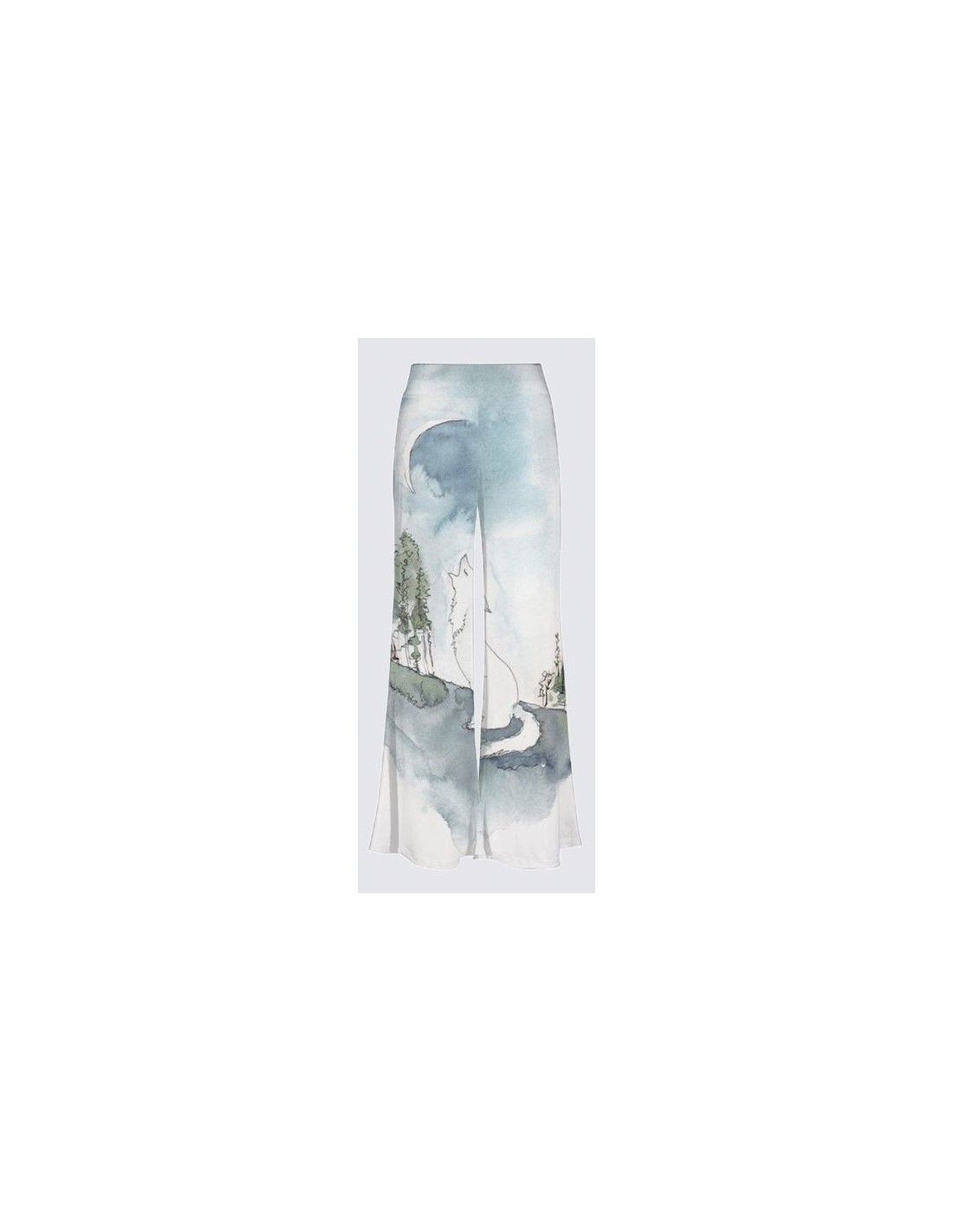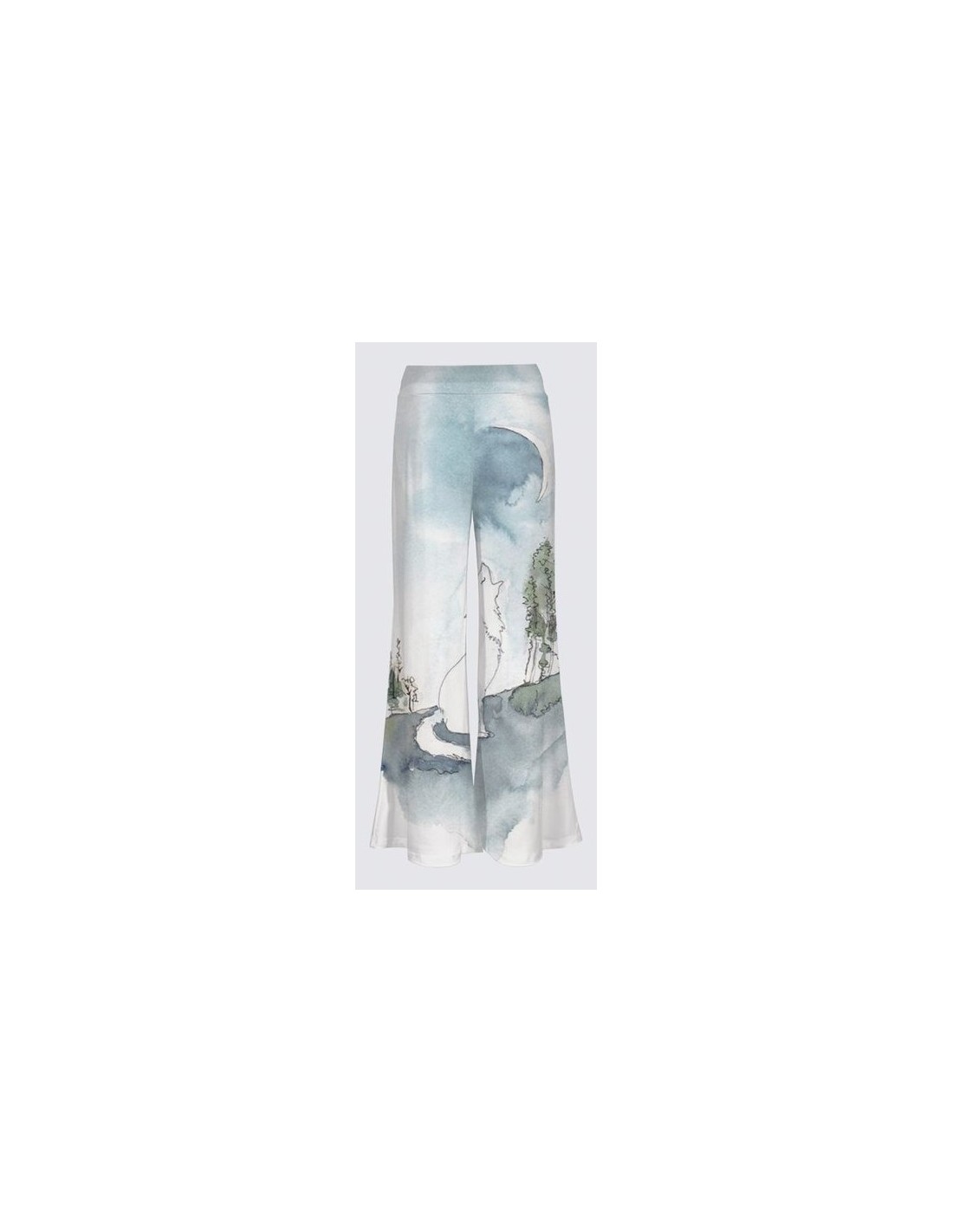 "Ombre de Lune" par l'artiste Christiane Lapointe. Pantalon palazzo très confortable, fabriqué en tricot ITY de qualité supérieure (95% polyester, 5% élasthanne) avec entrejambe de 30" de longueur et une taille haute. Lavez à la machine au cycle délicat, séchez à plat.