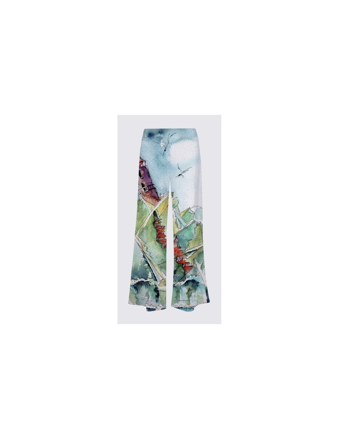 "Oasis" par l'artiste Christiane Lapointe. Pantalon très confortable, fabriqué d'un doux tricot avec base gris chiné (95% polyester, 5% élasthanne). Entrejambe de 29" de longueur, une taille haute avec bande élastique et jambe à coupe évasée. Lavez à la machine au cycle délicat, séchez à plat.
