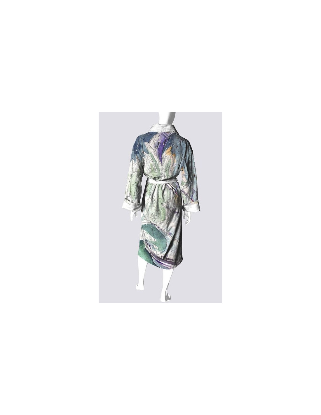 Cette robe est un incontournable pour ceux qui apprécient la qualité et l’art. Elle est fabriquée d’un tissu en microfibre (95% polyester, 5% spandex) avec un intérieur blanc et un col blanc. Elle est d'une longueur de 48" avec des manches mesurant 31" ou 25" lorsqu’elles sont retournées. Elle a deux poches spacieuses (6" x 6") et un devant ouvert avec une ceinture de (70".) La largeur du dos est de 24,5". Une taille unique qui conviendra à une femme jusqu’à la taille extra-large et un homme jusqu’à la taille large. Lavable à la machine au cycle délicat dans l’eau froide, séchez à plat.