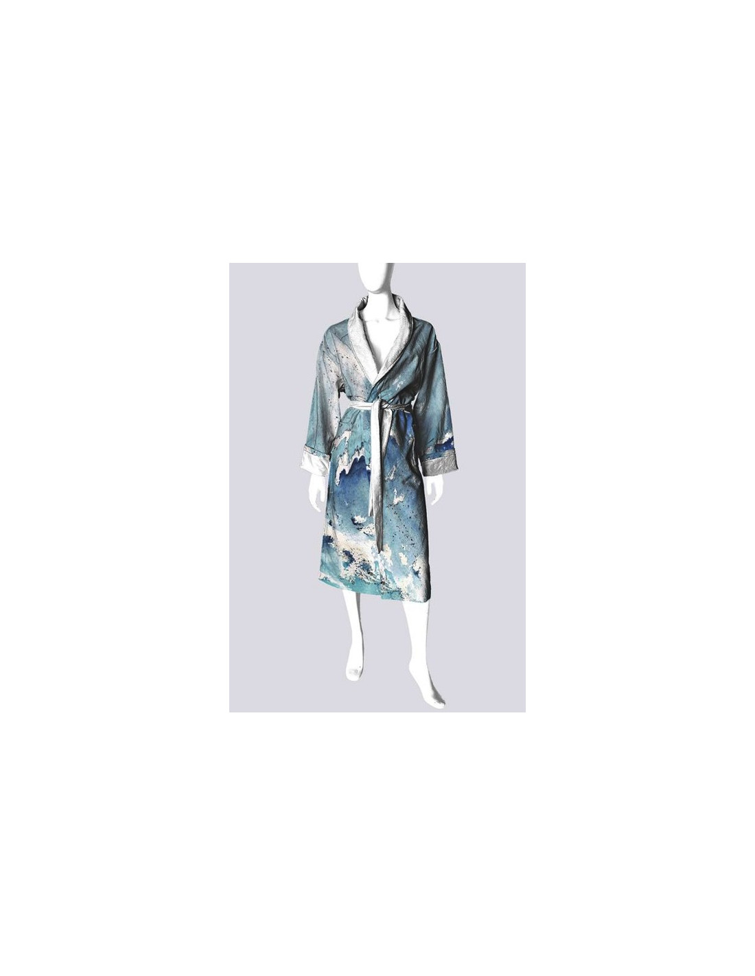 Cette robe est un incontournable pour ceux qui apprécient la qualité et l’art. Elle est fabriquée d’un tissu en microfibre (95% polyester, 5% spandex) avec un intérieur blanc et un col blanc. Elle est d'une longueur de 48" avec des manches mesurant 31" ou 25" lorsqu’elles sont retournées. Elle a deux poches spacieuses (6" x 6") et un devant ouvert avec une ceinture de (70".) La largeur du dos est de 24,5". Une taille unique qui conviendra à une femme jusqu’à la taille extra-large et un homme jusqu’à la taille large. Lavable à la machine au cycle délicat dans l’eau froide, séchez à plat.
