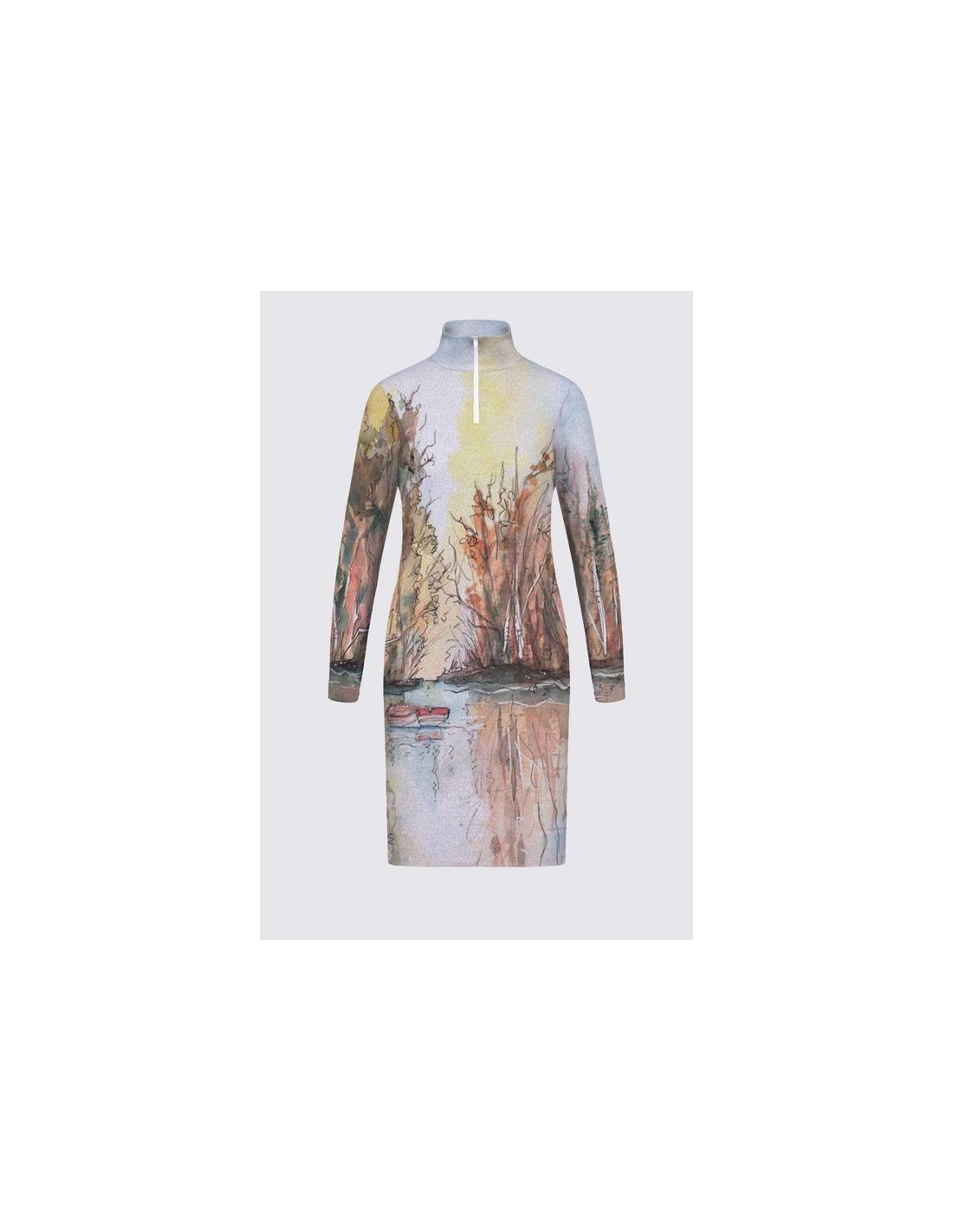 "Tranquillité" par l'artiste Christiane Lapointe. Tissu en maille pull doux et confortable en gris chiné, col cheminée haut avec fermeture éclair. La robe est semi-ajustée aux genoux avec des manches longues et une fente flatteuse à l'ourlet.