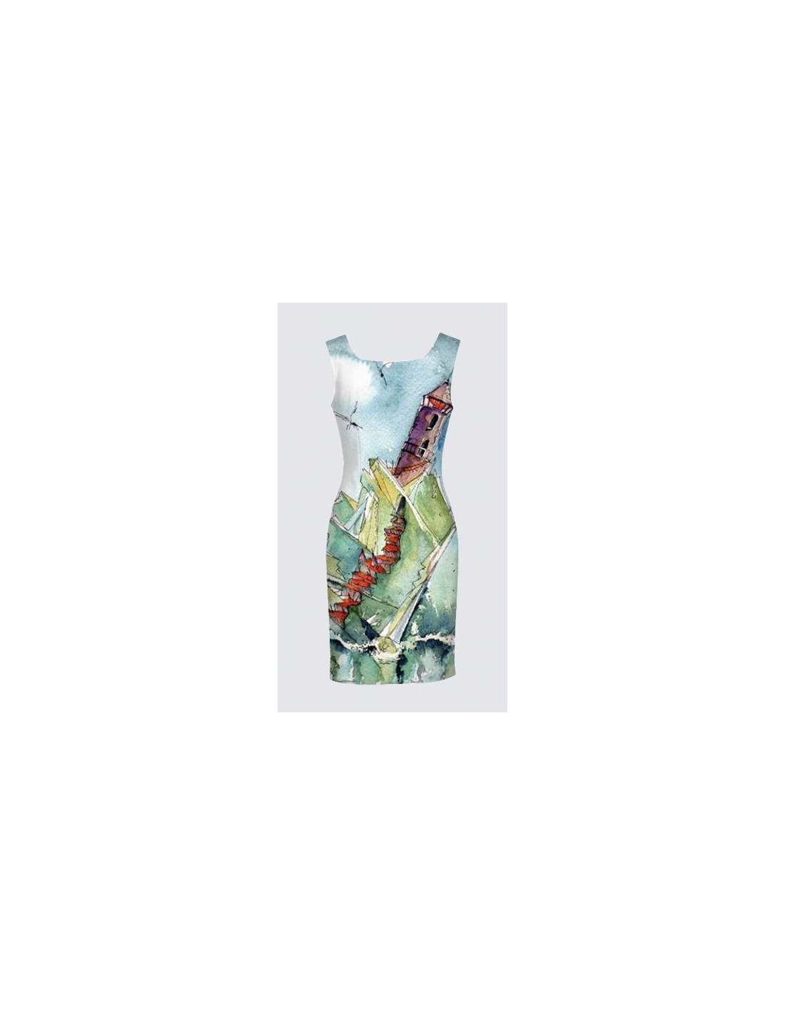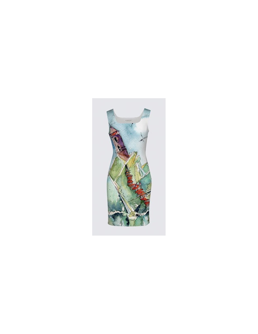 "Oasis" par l'artiste Christiane Lapointe. Encolure carrée avec pinces à la poitrine et au dos pour une coupe près du corps optimale. Tissu en tricot scuba extensible (95% Polyester / 5% Spandex) avec un fini doux et soyeux au toucher et une longueur de 38.5".