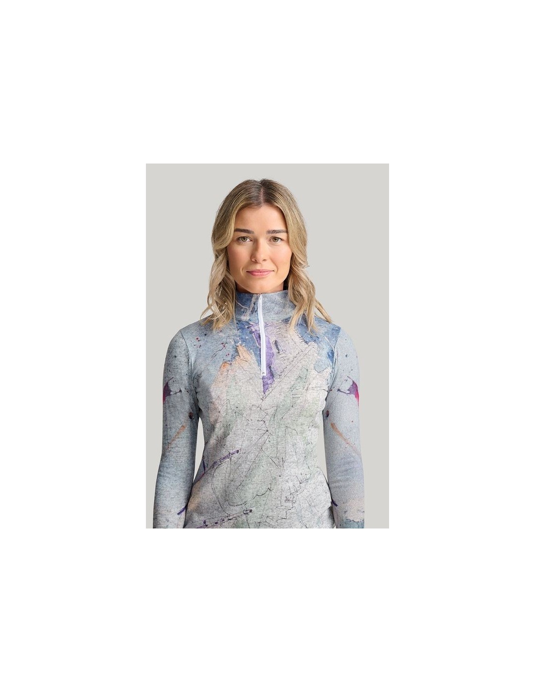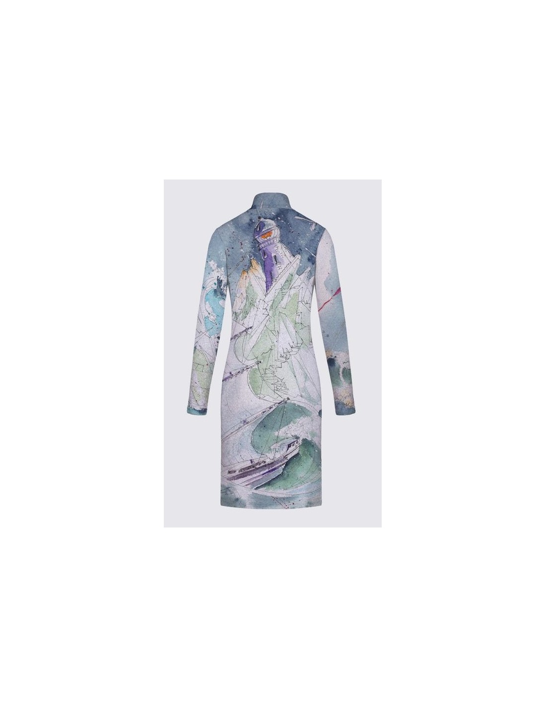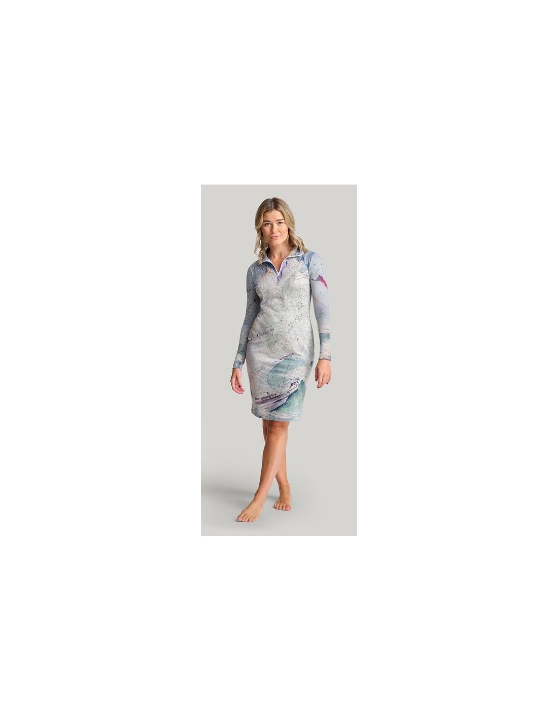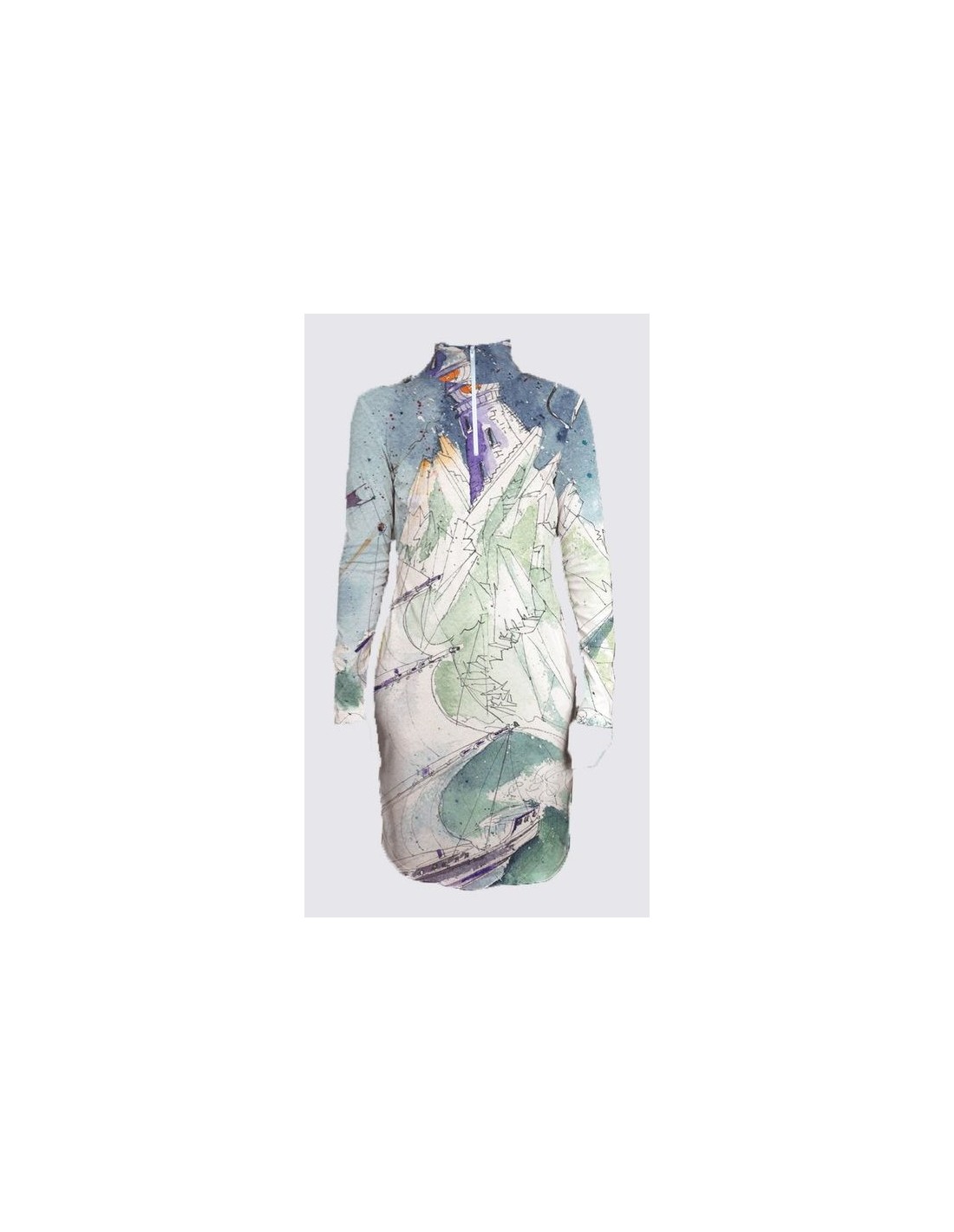 "Centrifuge" par l'artiste Christiane Lapointe. Tissu en maille pull doux et confortable en gris chiné, col cheminée haut avec fermeture éclair. La robe est semi-ajustée aux genoux avec des manches longues et une fente flatteuse à l'ourlet.