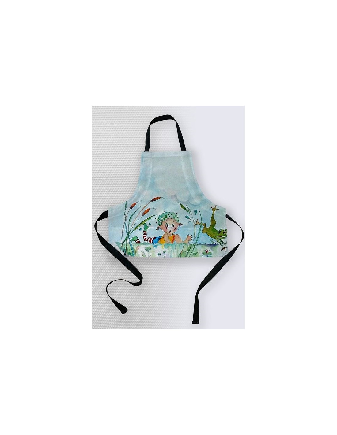 "Escapade" par l'artiste Christiane Lapointe. Tablier pour enfant de taille 17" x 18" en toile texturée (100% polyester) avec sangle ajustable, bretelles 100% coton noir et trois poches. Lavable à la machine à l'eau froide au cycle délicat.