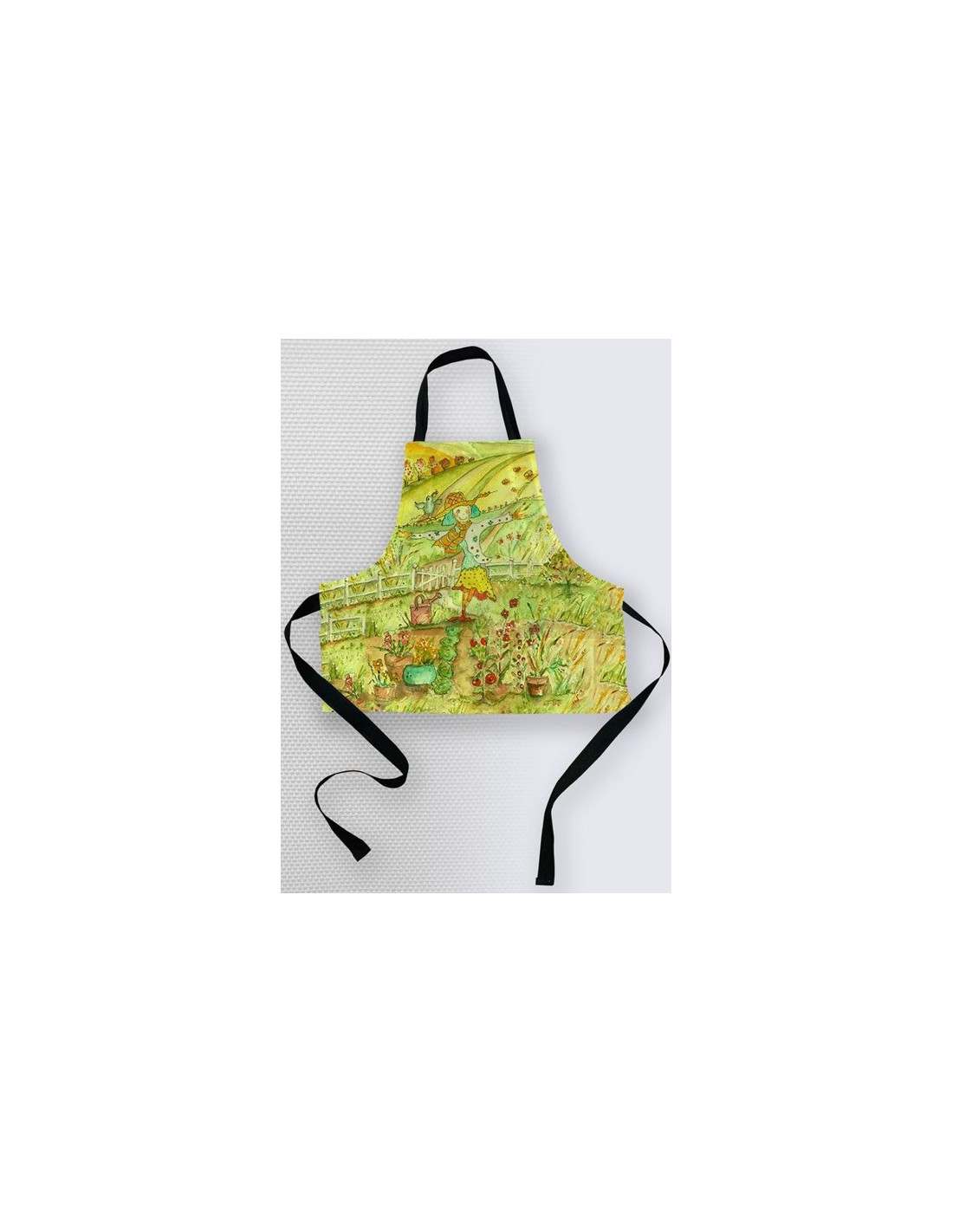 "Radiance" par l'artiste Christiane Lapointe. Tablier pour enfant de taille 17" x 18" en toile texturée (100% polyester) avec sangle ajustable, bretelles 100% coton noir et trois poches. Lavable à la machine à l'eau froide au cycle délicat.