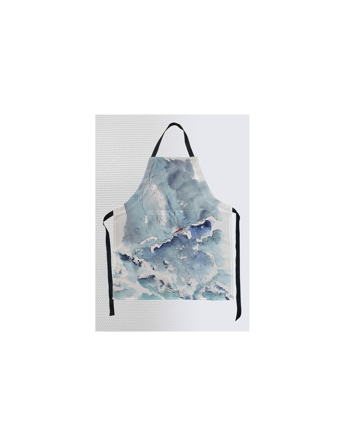 "Turbulence" par l'artiste Christiane Lapointe. Tablier pour adulte de taille 21" x 36" en toile texturée (100% polyester) avec sangle ajustable, bretelles 100% coton noir et poche avant. Lavable à la machine à l'eau froide au cycle délicat.