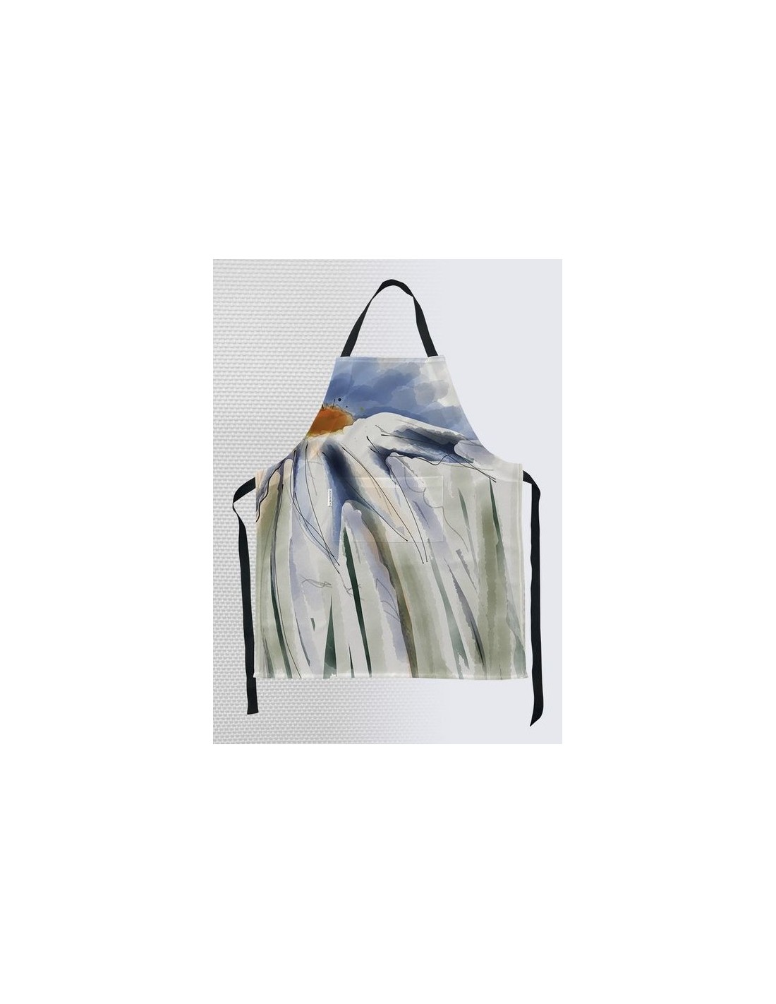 "Perlouse" par l'artiste Christiane Lapointe. Tablier pour adulte de taille 21" x 36" en toile texturée (100% polyester) avec sangle ajustable, bretelles 100% coton noir et poche avant. Lavable à la machine à l'eau froide au cycle délicat.