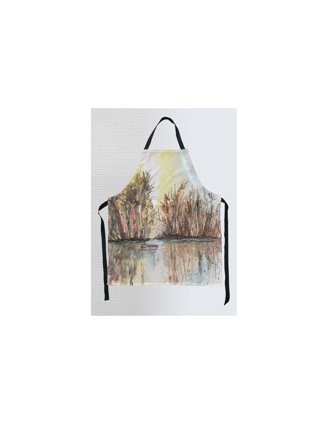 "Tranquilité" par l'artiste Christiane Lapointe. Tablier pour adulte de taille 21" x 36" en toile texturée (100% polyester) avec sangle ajustable, bretelles 100% coton noir et poche avant. Lavable à la machine à l'eau froide au cycle délicat.