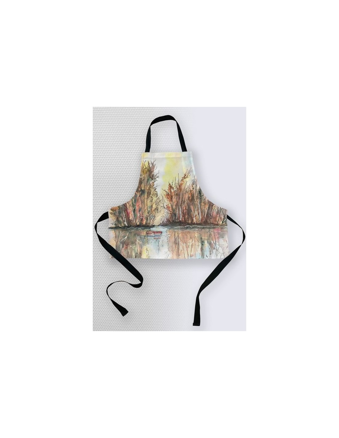 "Tranquillité" par l'artiste Christiane Lapointe. Tablier pour enfant de taille 17" x 18" en toile texturée (100% polyester) avec sangle ajustable, bretelles 100% coton noir et trois poches. Lavable à la machine à l'eau froide au cycle délicat.