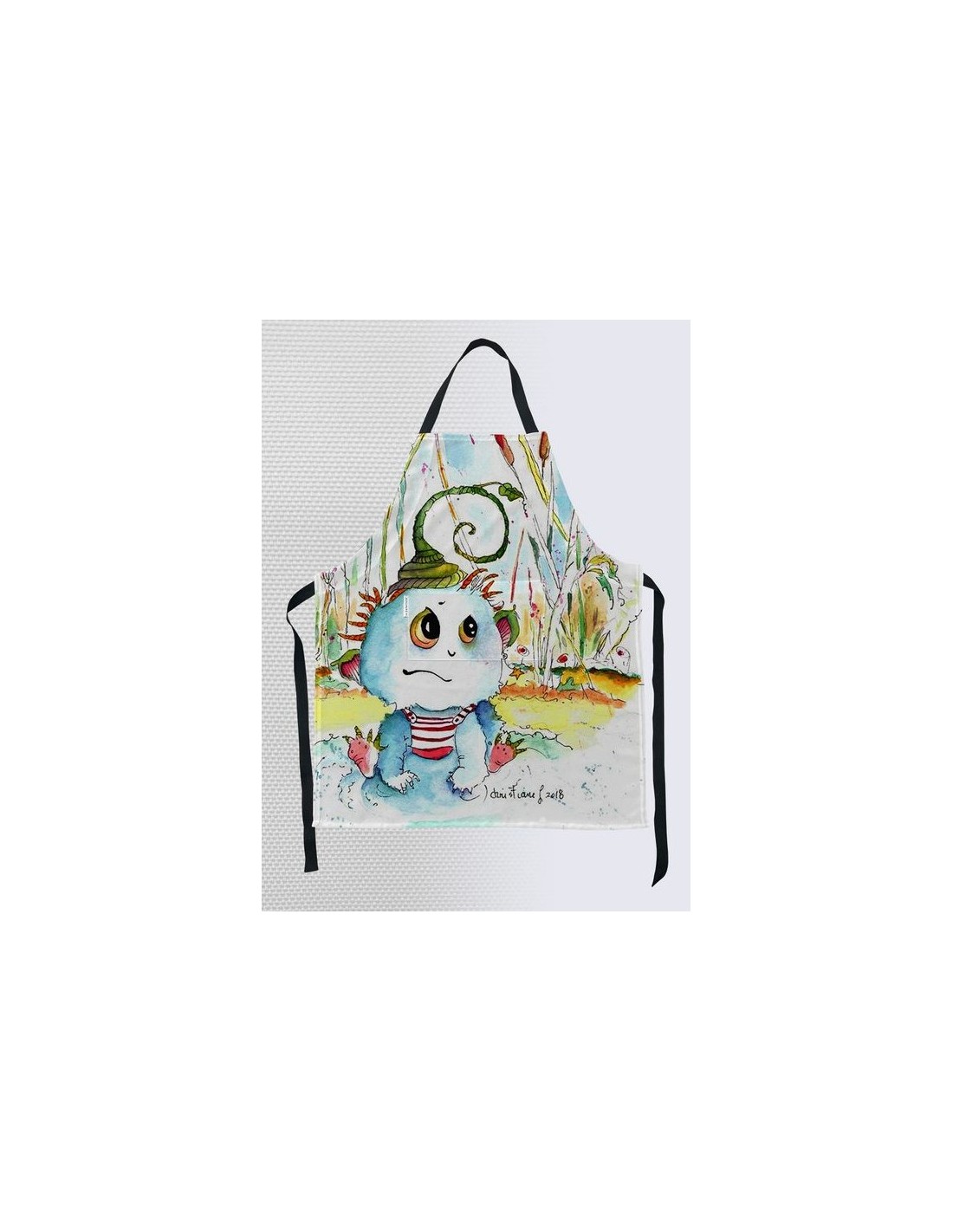 "Perplexité" par l'artiste Christiane Lapointe. Tablier pour adulte de taille 21" x 36" en toile texturée (100% polyester) avec sangle ajustable, bretelles 100% coton noir et poche avant. Lavable à la machine à l'eau froide au cycle délicat.