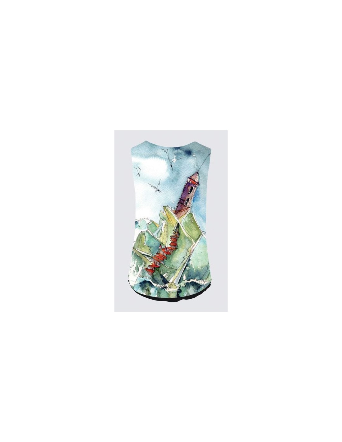 "Oasis" par l'artiste Christiane Lapointe. Débardeur d'une longueur de 27" et réversible (imprimé d'œuvre d'art originale sur un côté et complètement noir sur l'autre côté) qui peut être porté de 4 façons (col V à l'arrière). Coupe fluide avec encolure dégagée à 8.5”. Tissu et doublure en tricot ITY de qualité supérieure (95% Polyester, 5% Élasthanne).