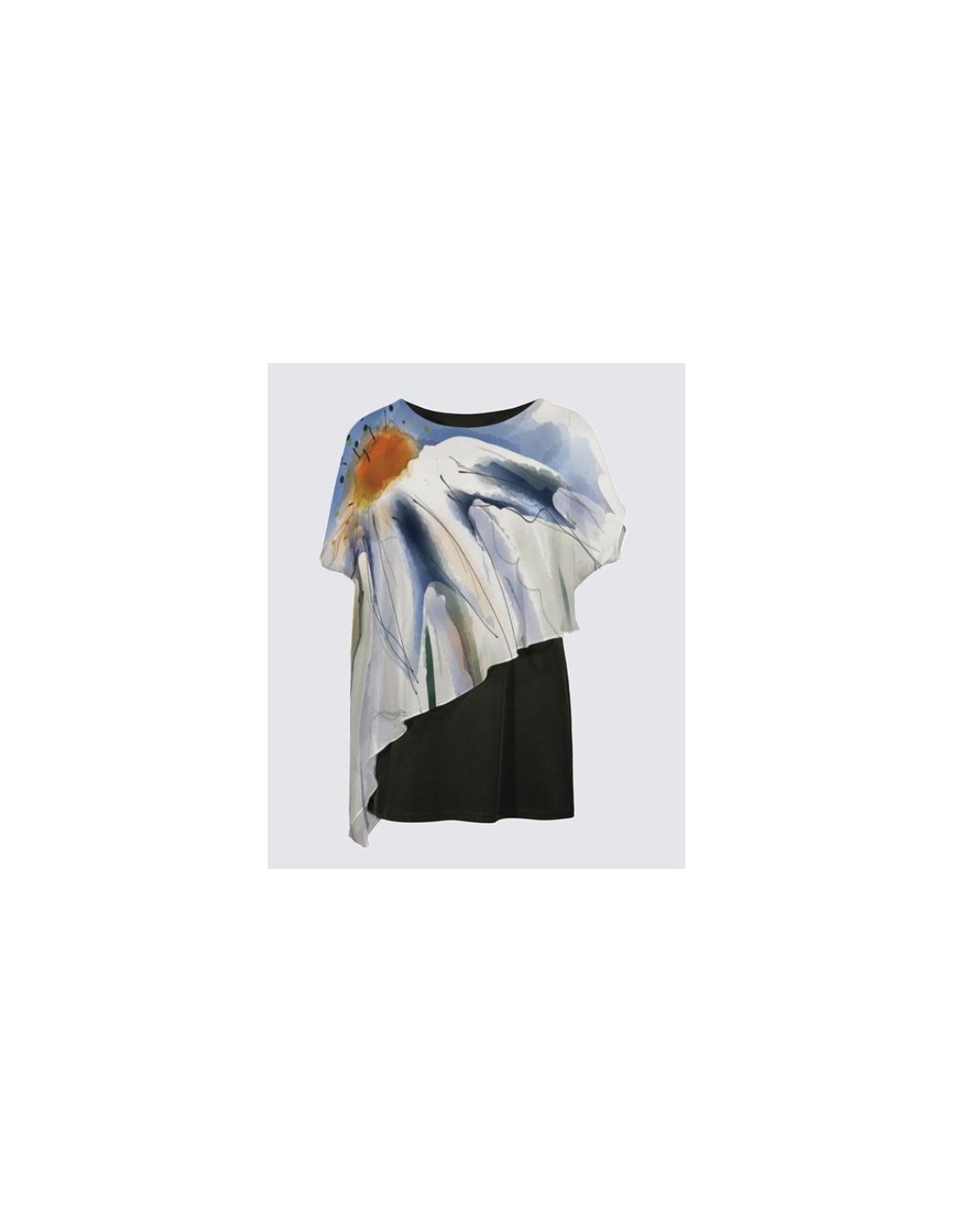 "Perlouse" par l'artiste Christiane Lapointe. Débardeur d'une longueur de 26" avec camisole noire extensible à l'intérieur et une cape asymétrique en chiffon transparent qui couvre les épaules et le haut des bras. Tissu en tricot ITY de qualité supérieure (95% Polyester, 5% Élasthanne). Cape en chiffon (100% Polyester).