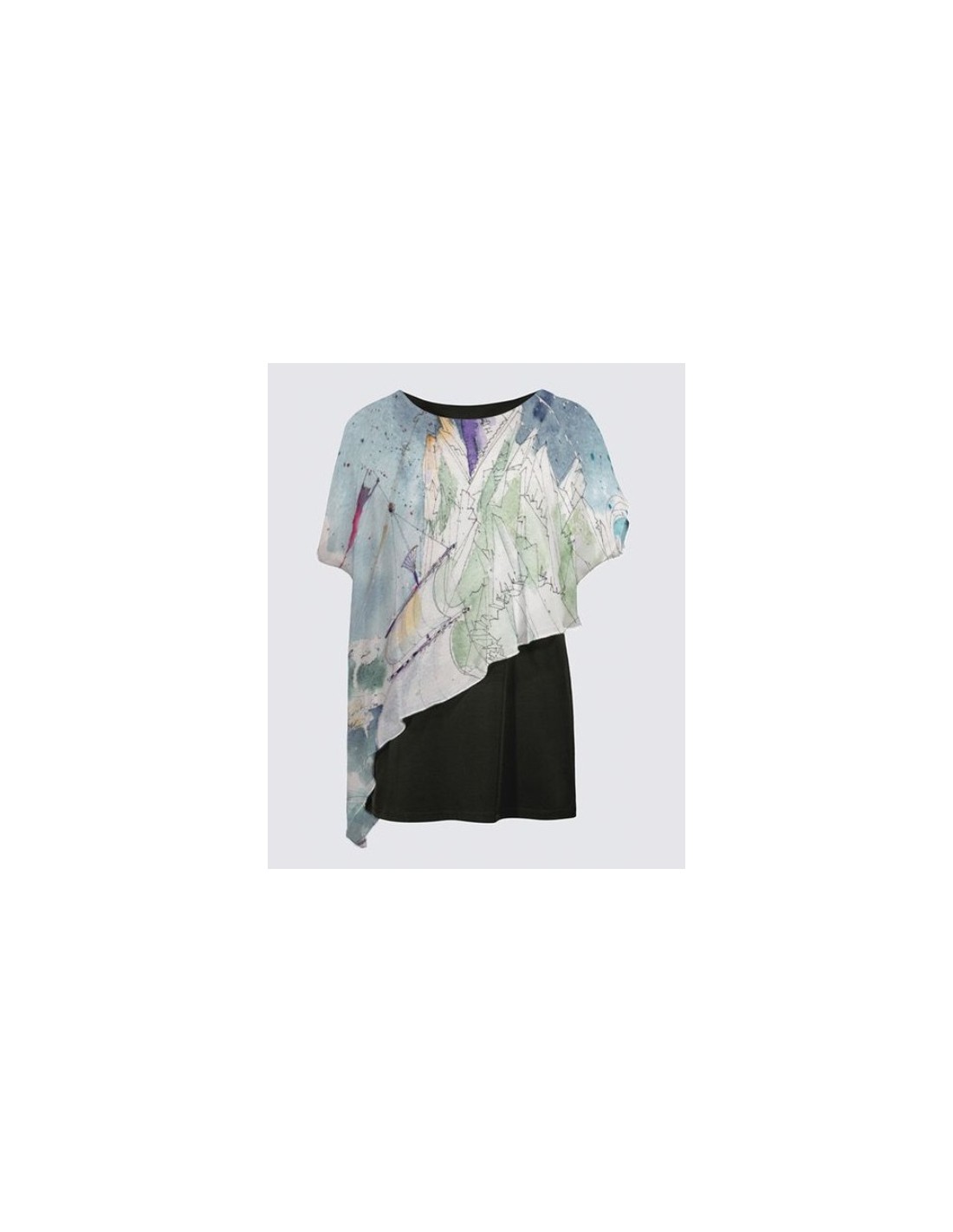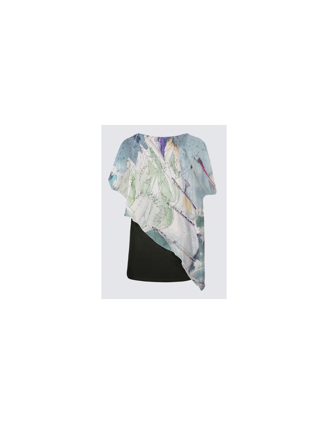 "Centrifuge" par l'artiste Christiane Lapointe. Débardeur d'une longueur de 26" avec camisole noire extensible à l'intérieur et une cape asymétrique en chiffon transparent qui couvre les épaules et le haut des bras. Tissu en tricot ITY de qualité supérieure (95% Polyester, 5% Élasthanne). Cape en chiffon (100% Polyester).