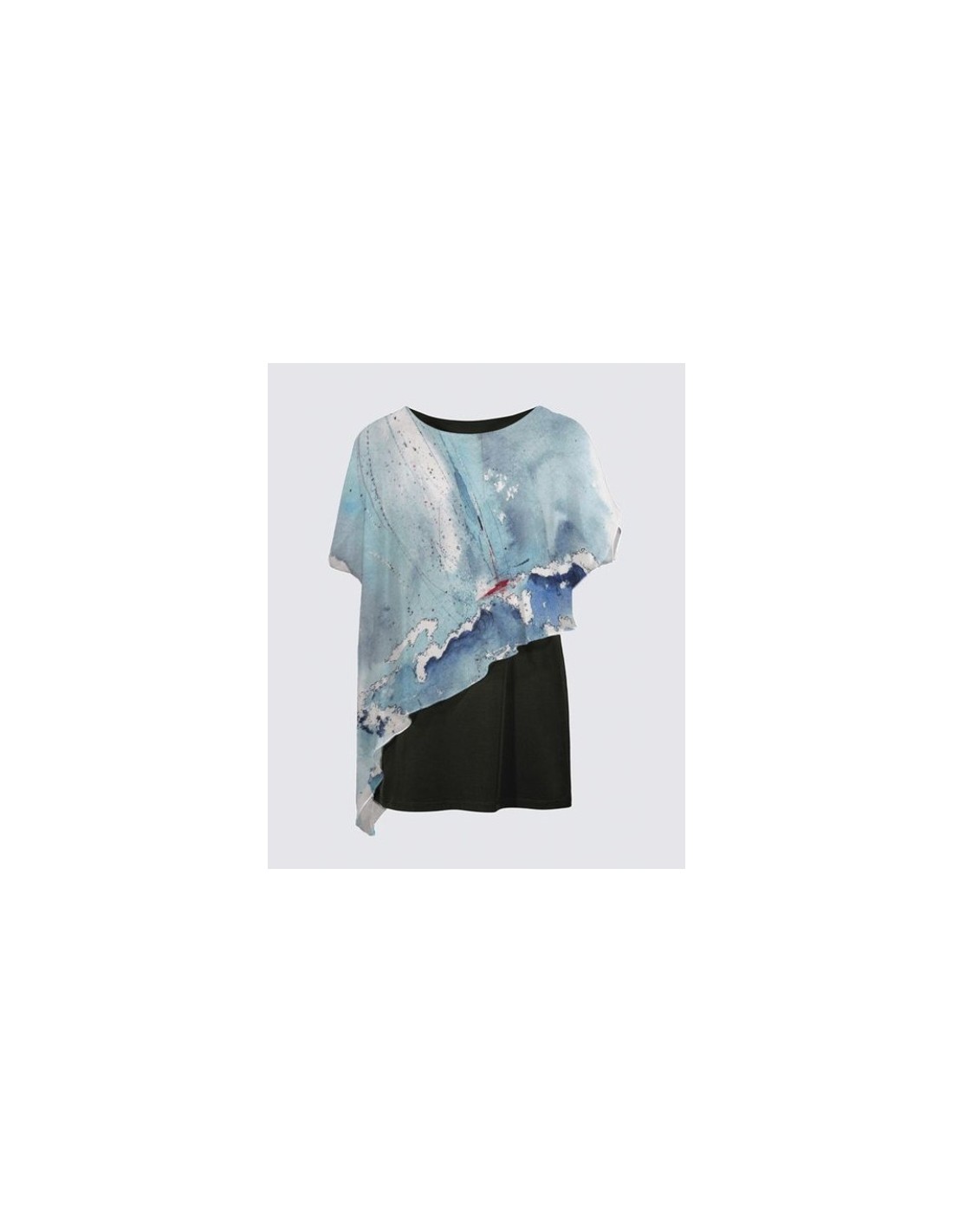 "Turbulence" par l'artiste Christiane Lapointe. Débardeur d'une longueur de 26" avec camisole noire extensible à l'intérieur et une cape asymétrique en chiffon transparent qui couvre les épaules et le haut des bras. Tissu en tricot ITY de qualité supérieure (95% Polyester, 5% Élasthanne). Cape en chiffon (100% Polyester).