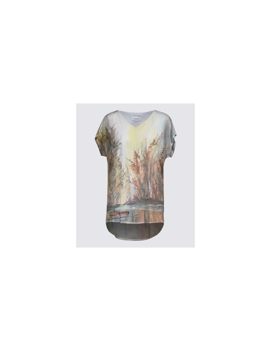 "Tranquillité" par l'artiste Christiane Lapointe. Camisole blanche en tricot ITY (95% Polyester, 5% Élasthanne) avec extérieur en chiffon (100% Polyester) de coupe asymétrique avec manches Dolman. Longueur 31.5". Fait surdimensionner (achetez une taille plus petite que celle que vous achèteriez normalement).