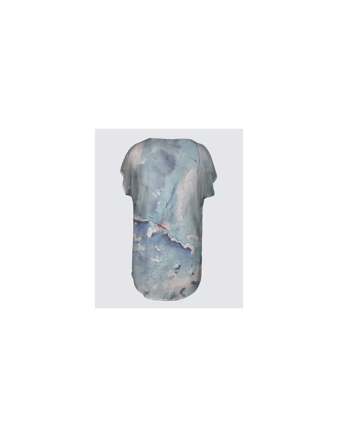 "Turbulence" par l'artiste Christiane Lapointe. Camisole blanche en tricot ITY (95% Polyester, 5% Élasthanne) avec extérieur en chiffon (100% Polyester) de coupe asymétrique avec manches Dolman. Longueur 31.5". Fait surdimensionner (achetez une taille plus petite que celle que vous achèteriez normalement).