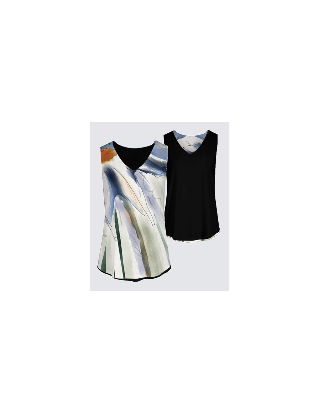 "Perlouse" par l'artiste Christiane Lapointe. Débardeur d'une longueur de 27" et réversible (imprimé d'œuvre d'art originale sur un côté et complètement noir sur l'autre côté) qui peut être porté de 4 façons (col V à l'arrière). Coupe fluide avec encolure dégagée à 8.5”. Tissu et doublure en tricot ITY de qualité supérieure (95% Polyester, 5% Élasthanne).